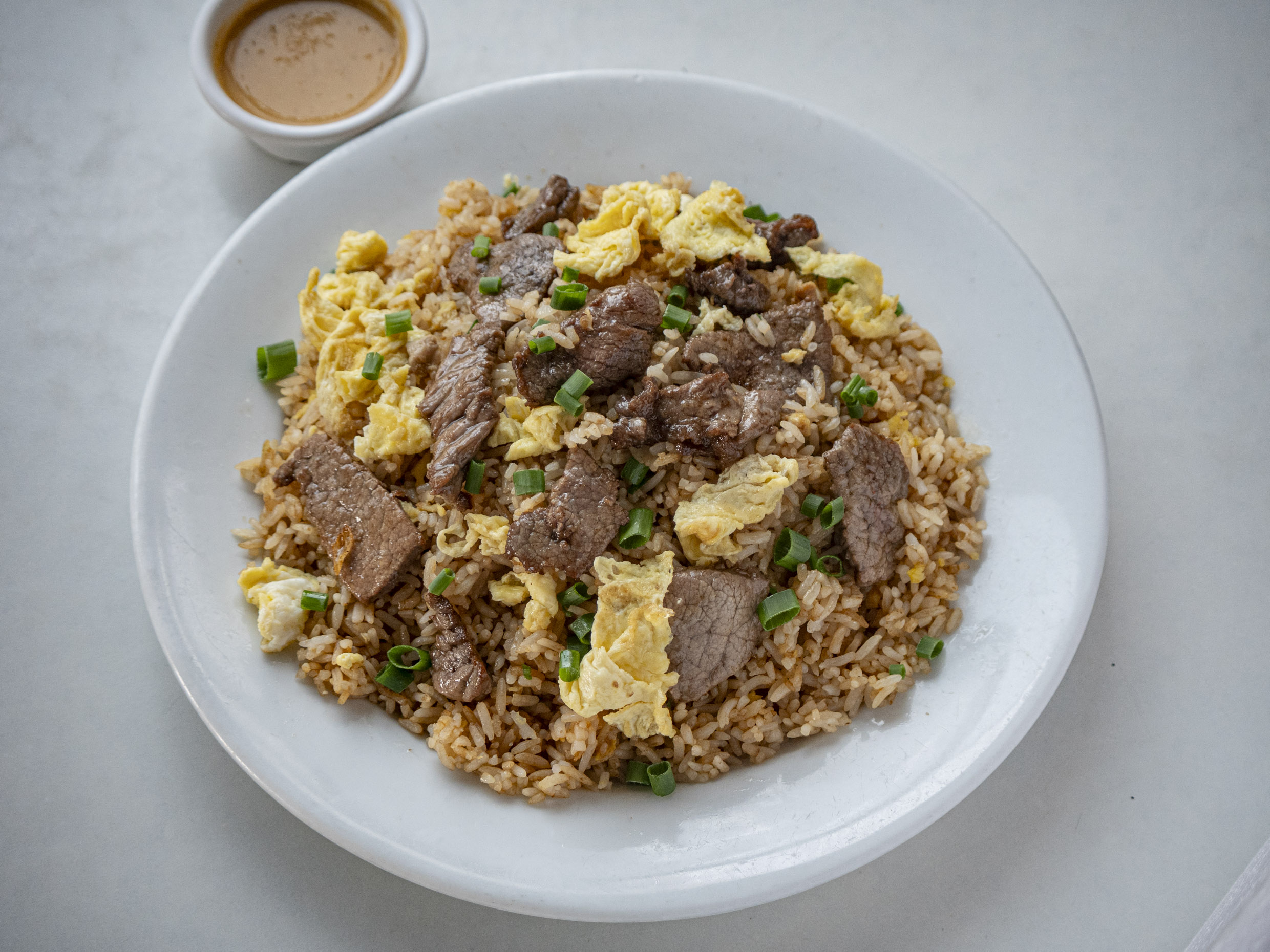 Chaufa de carne de res con extra huevo y un toque de ingredientes especiales.