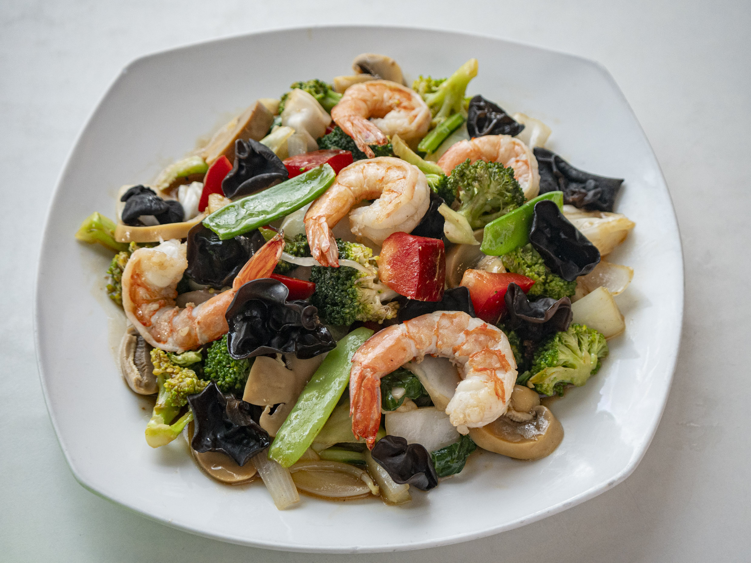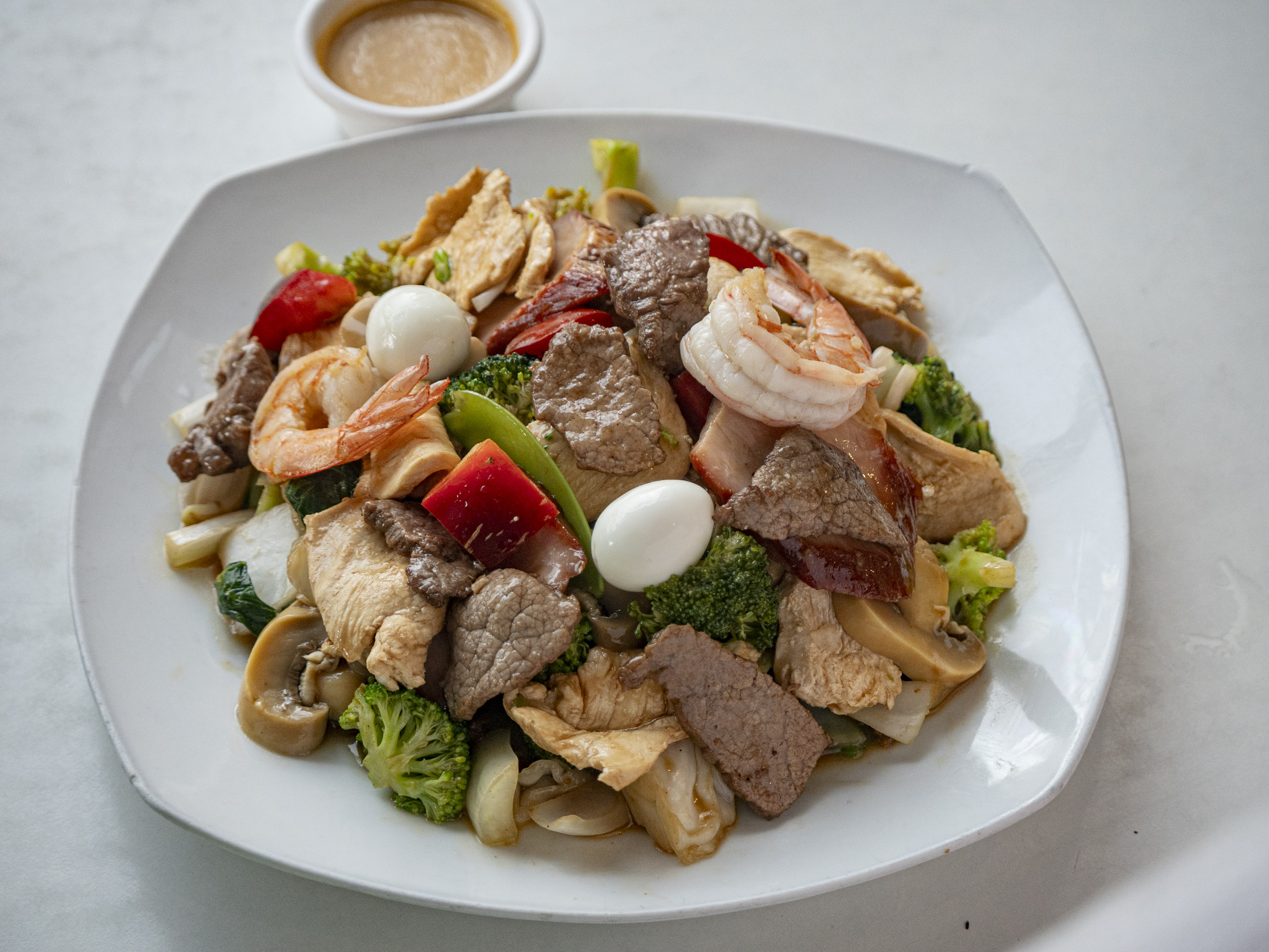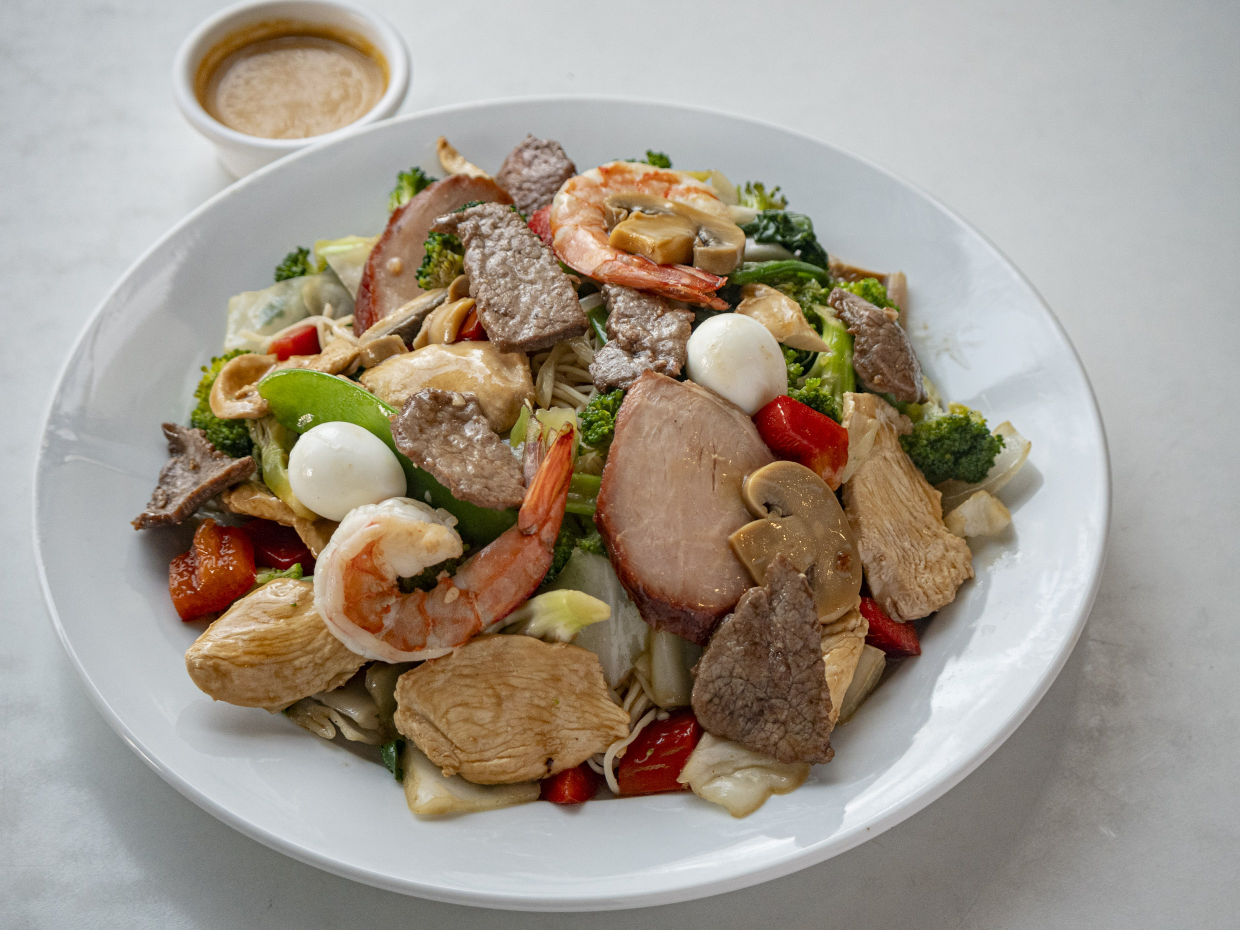 Incluye pollo, carne, chancho y langostino con champiñones, huevo y fideos Fan Si.