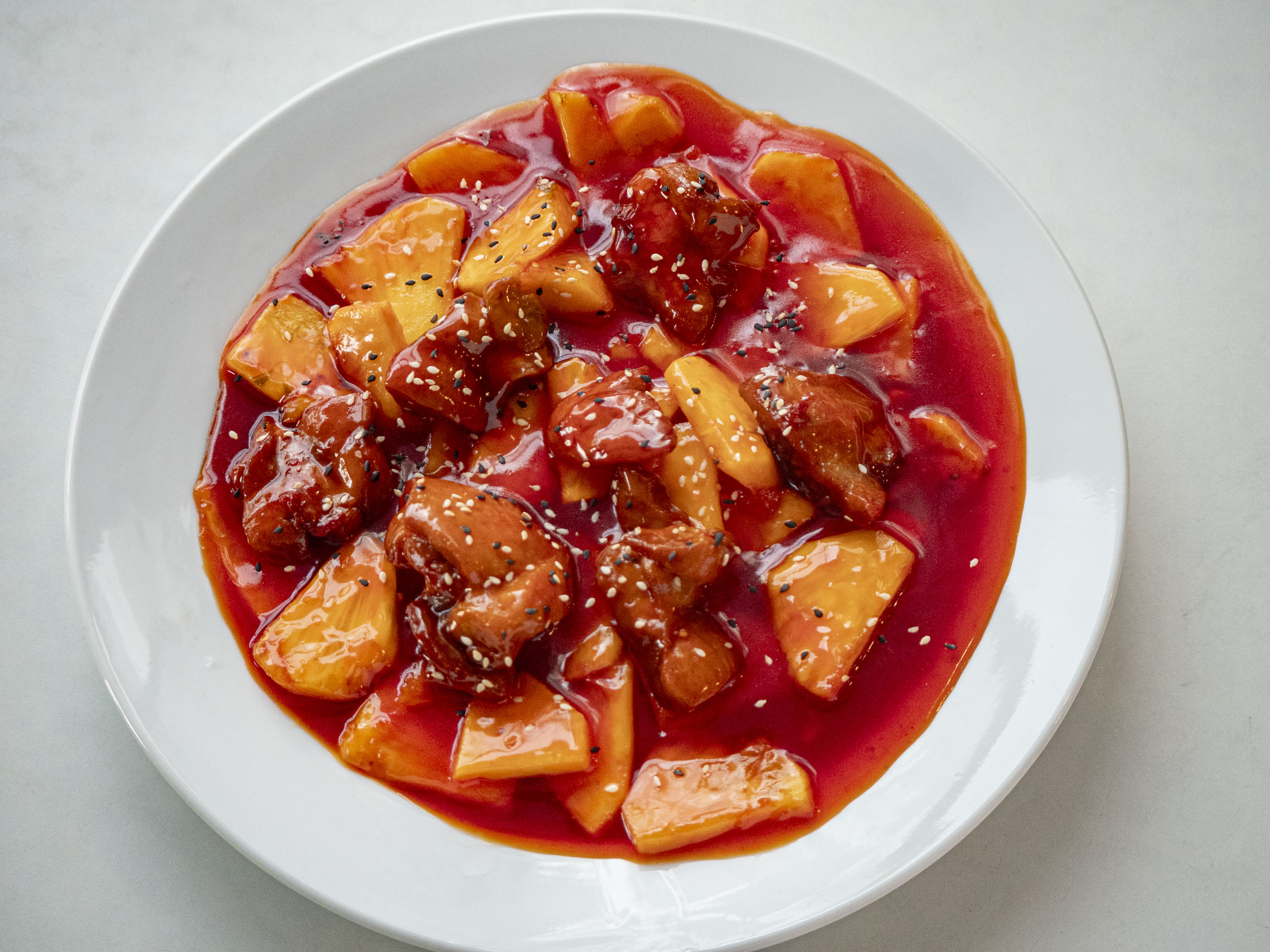 Fuente personal de Pollo frito con piña y salsa de tamarindo.