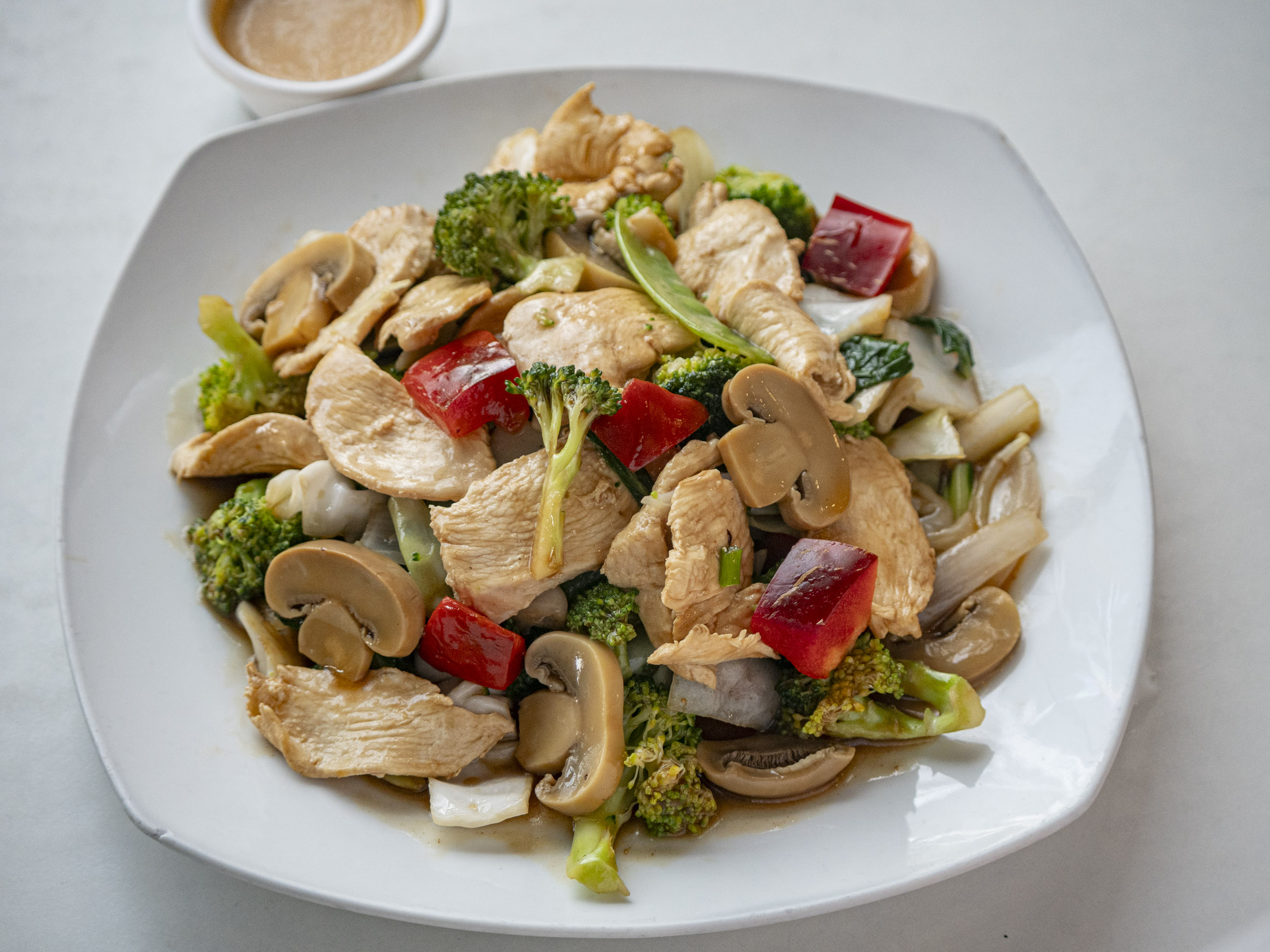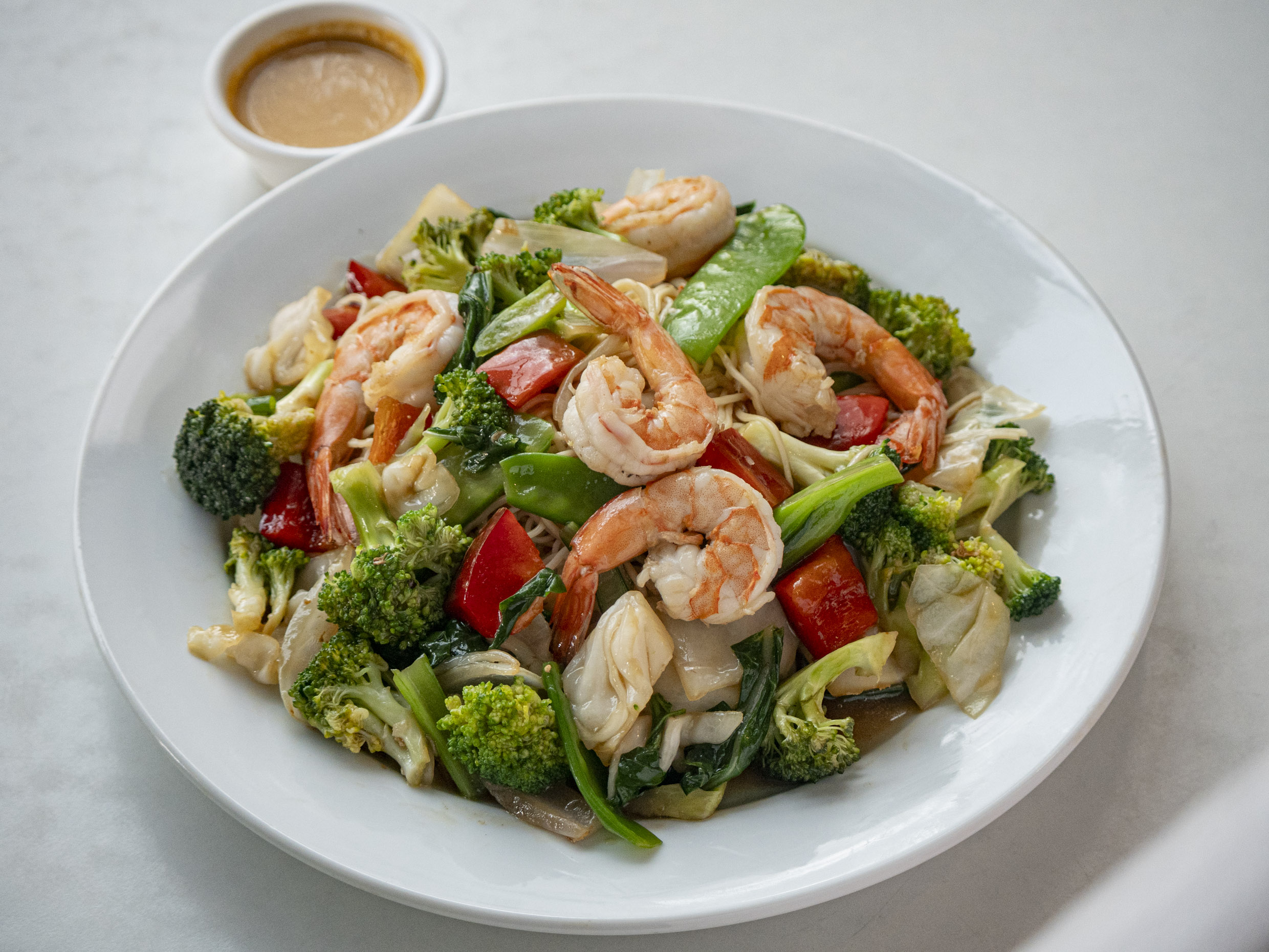 Delicioso salteado de verduras con trozos de pechuga con tallarines + Entrada
