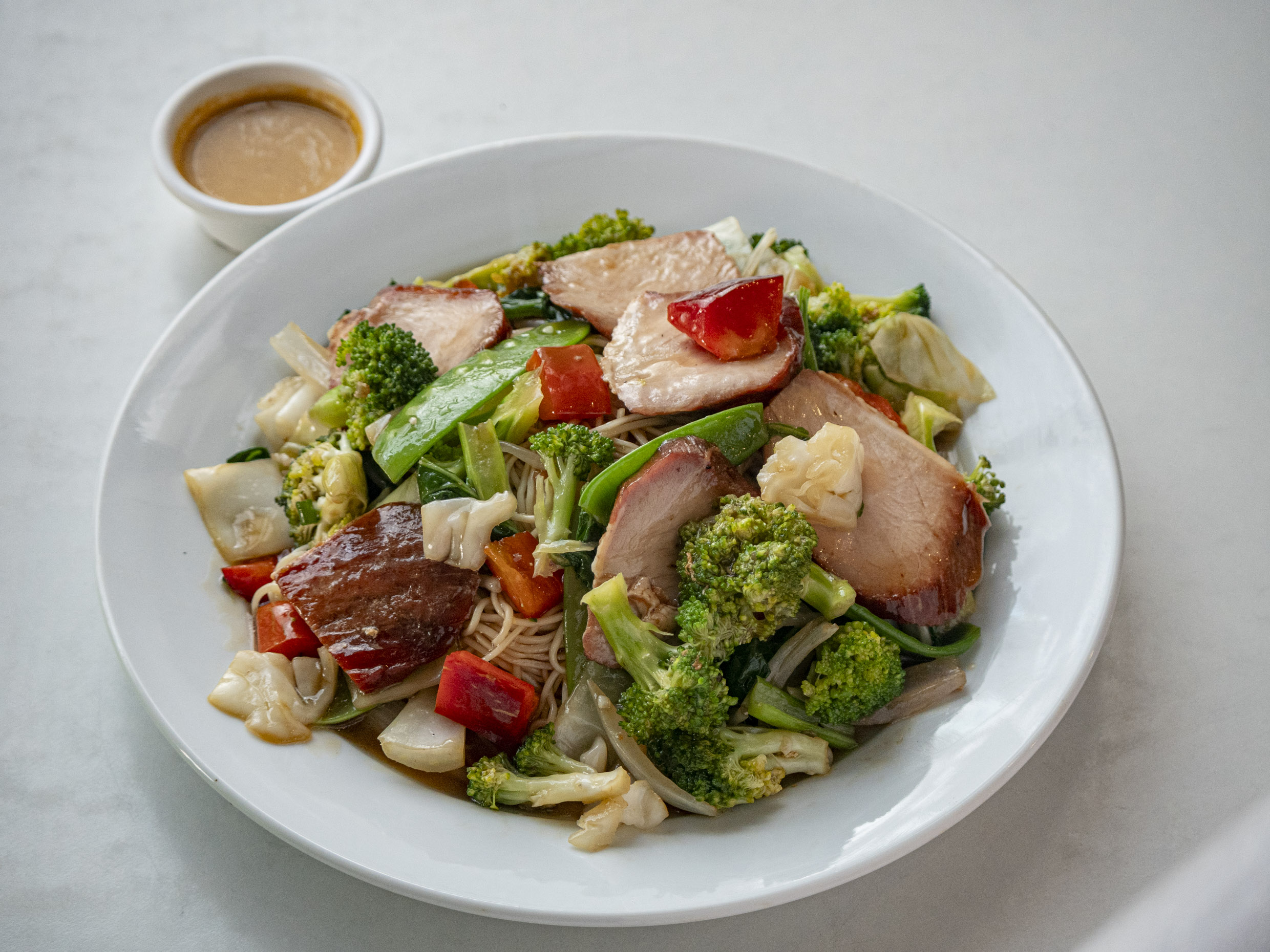 Fuente personal de Tallarin con chancho salteado con verduras.