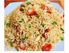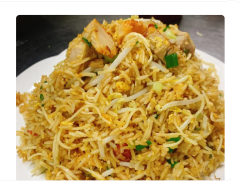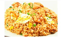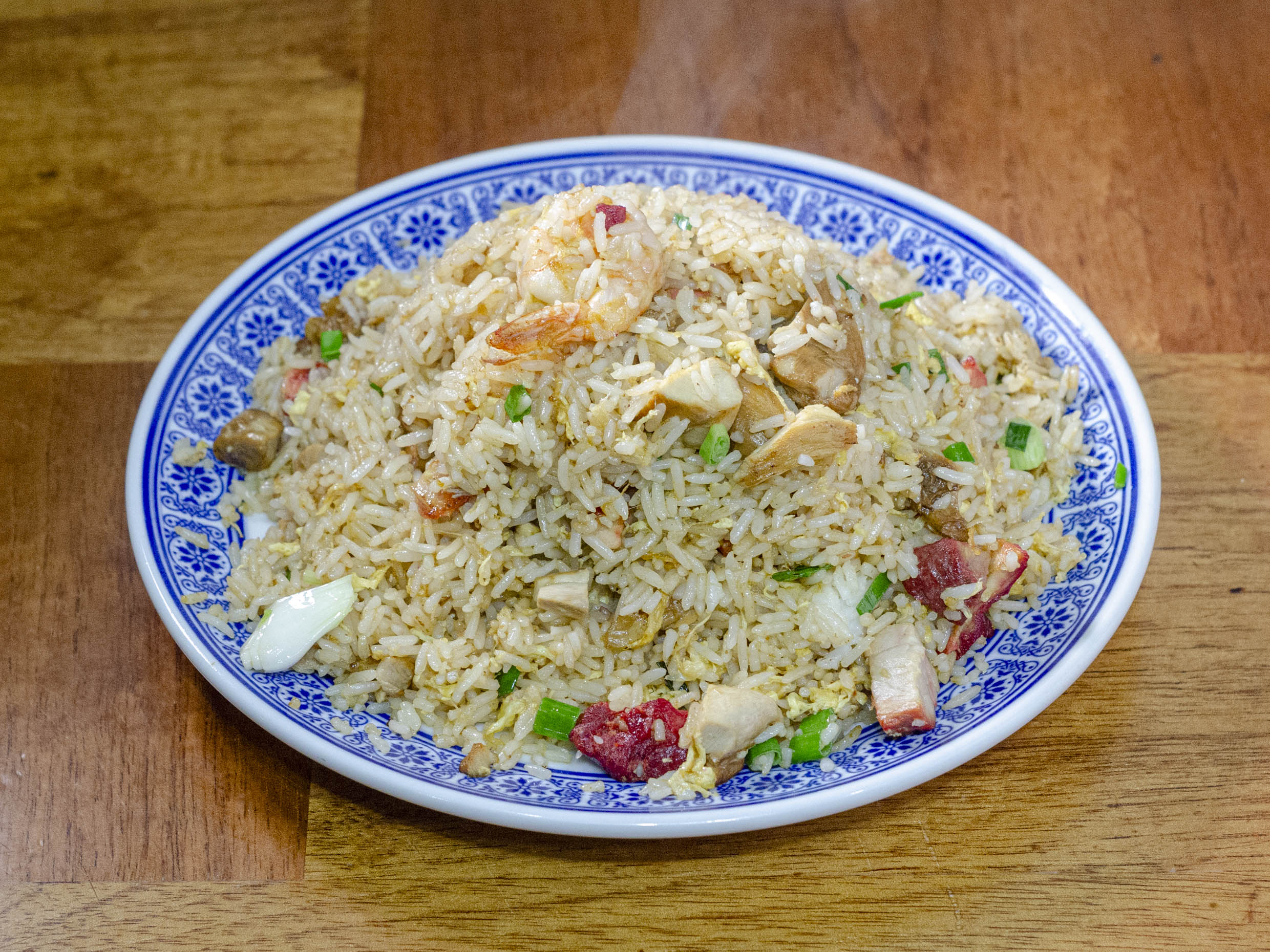 arroz chaufa, pollo al sillao, chancho asado, langostino, huevo y cebolla china.