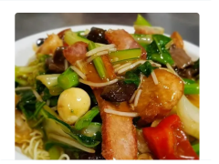Arroz chaufa de pollo, tallarín salteado con chancho, pollo sancochado, huevo de codorniz y langostino.