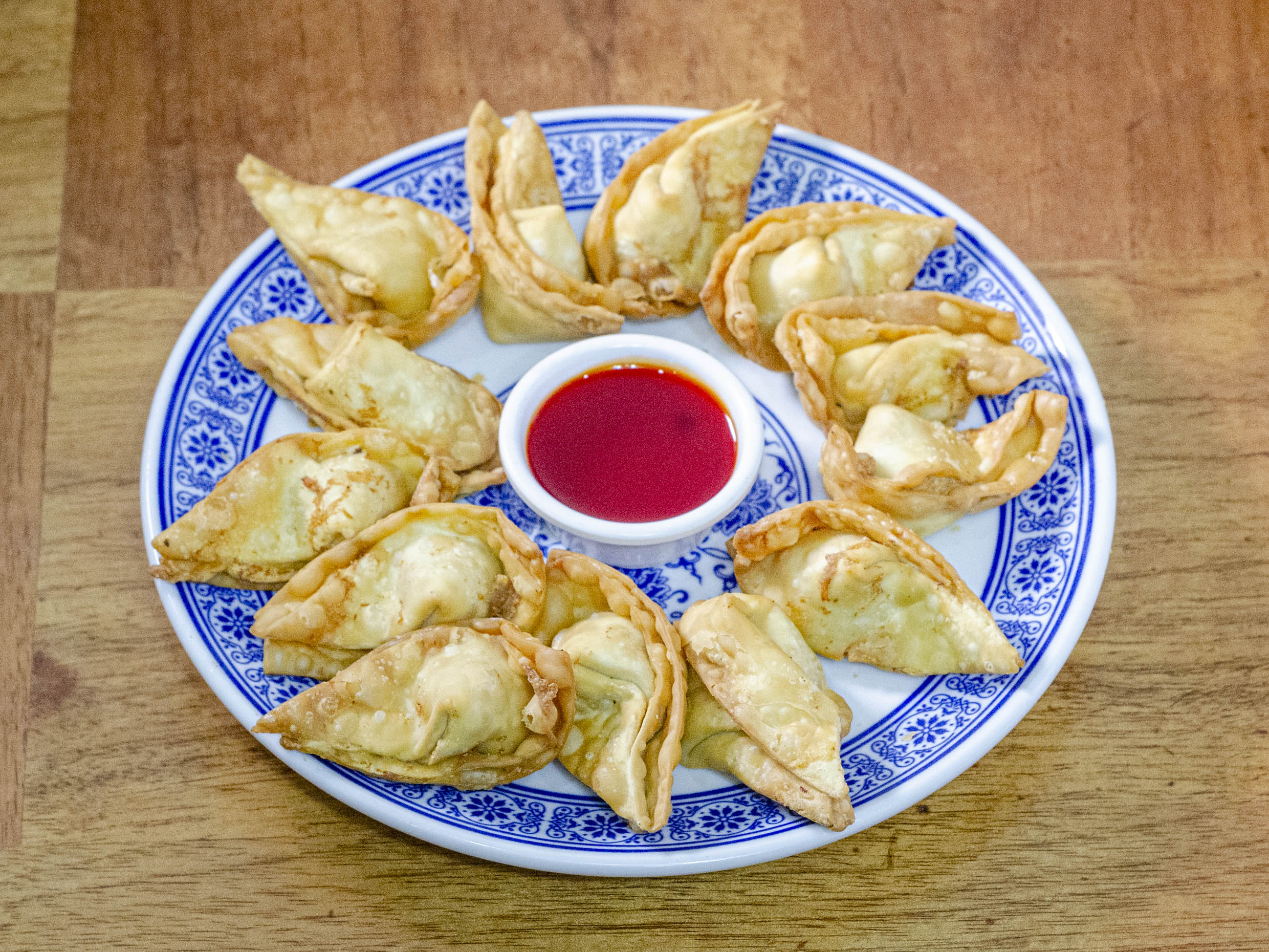 Wantanes fritos rellenos de chancho, pollo, acompañado de salsa de tamarindo.