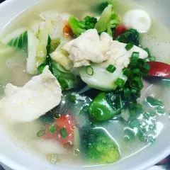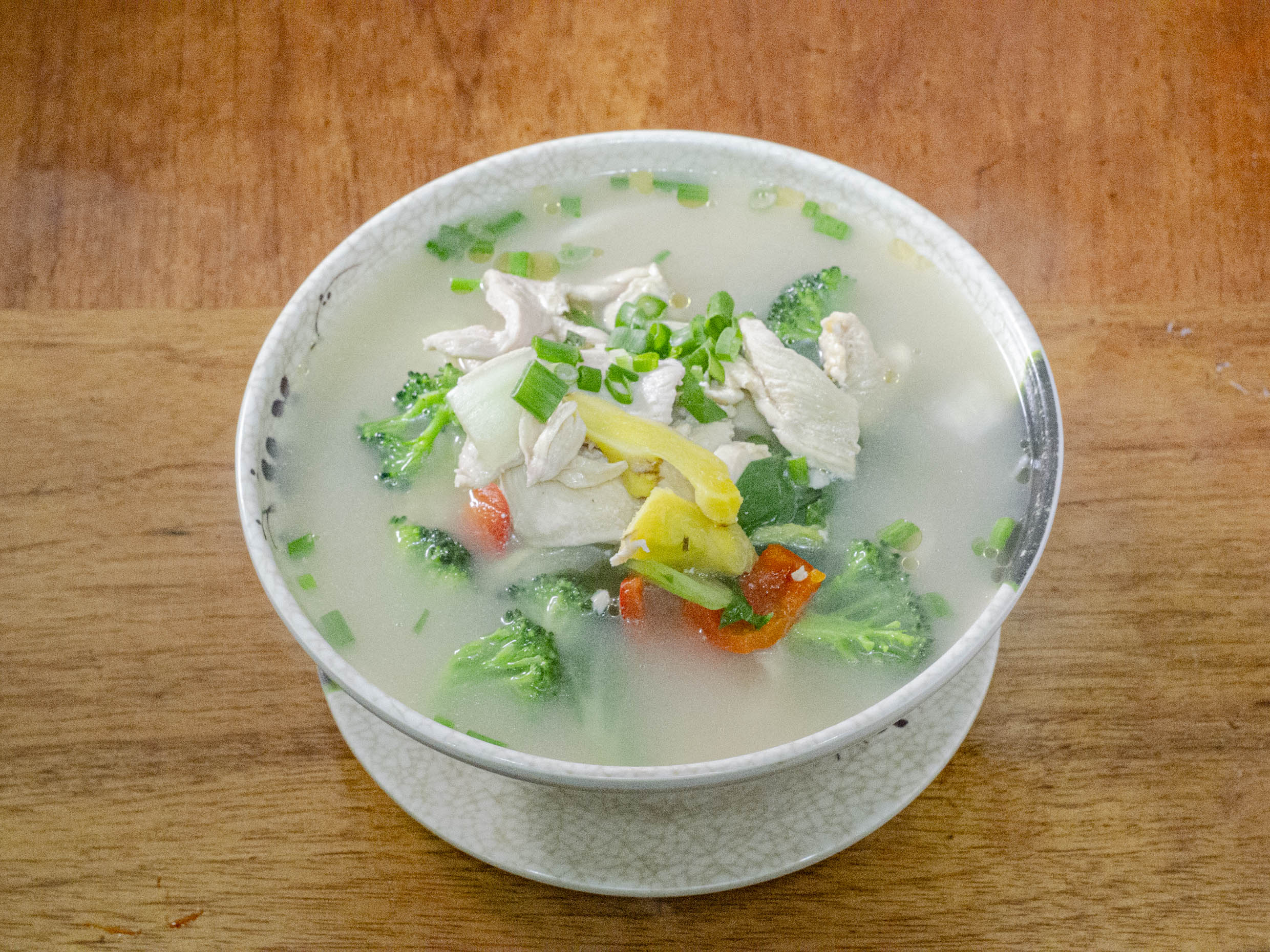 Caldo de pollo acompañado de wantanes, tallarín clásico, verduras y pollo sancochado.