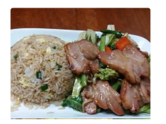 Arroz chaufa, láminas de chancho asado con salsa de tamarindo y piña.