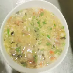Crema de caldo de pollo, batido de huevo, trozo pequeño de pollo sancochado, chancho asado, langostino y verdura.