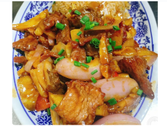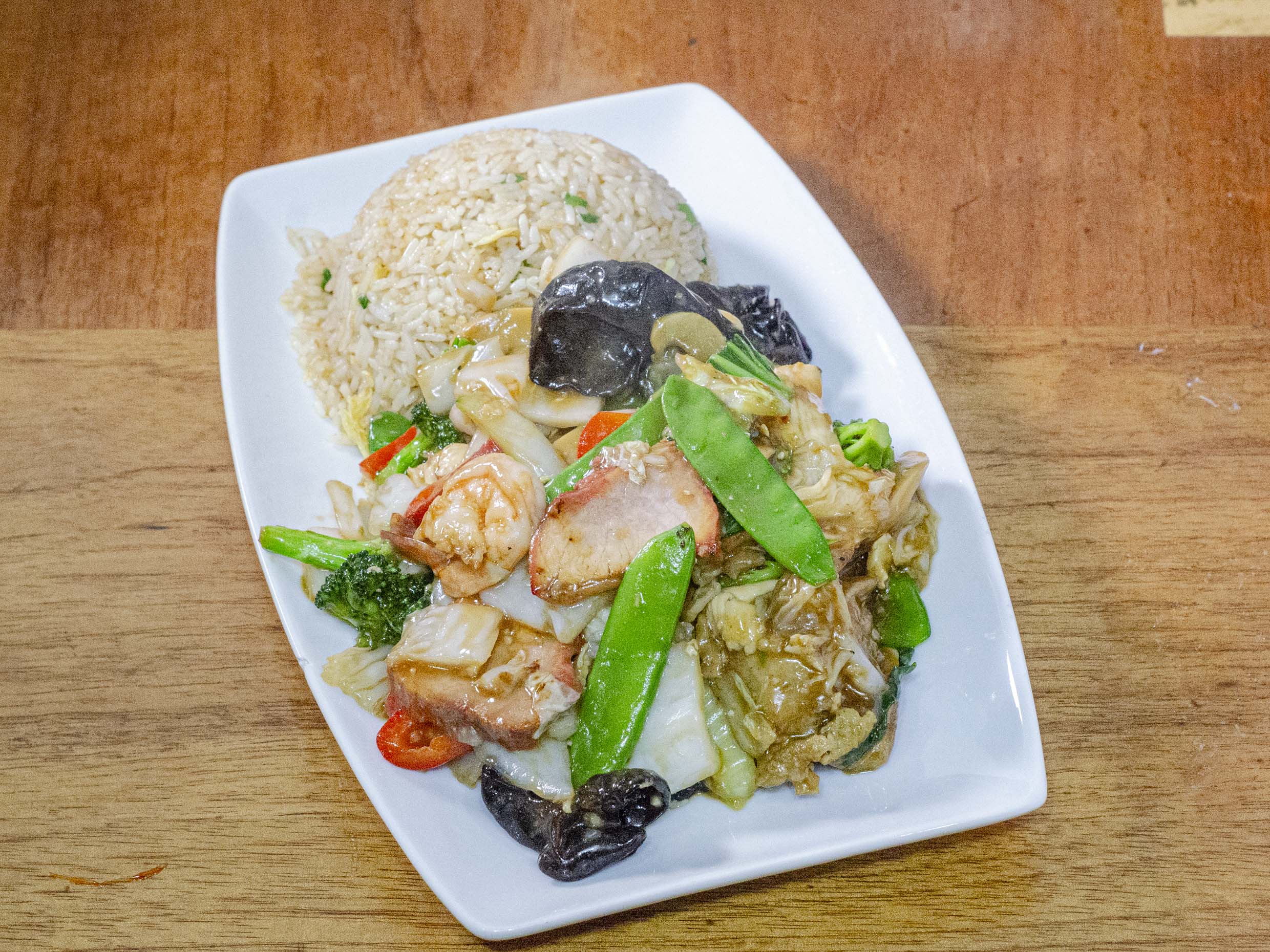 Arroz chaufa, kam lu wantán (chancho asado, pollo sancochado, pollo en trozos, langostino, huevo de codorniz, piña y verduras).