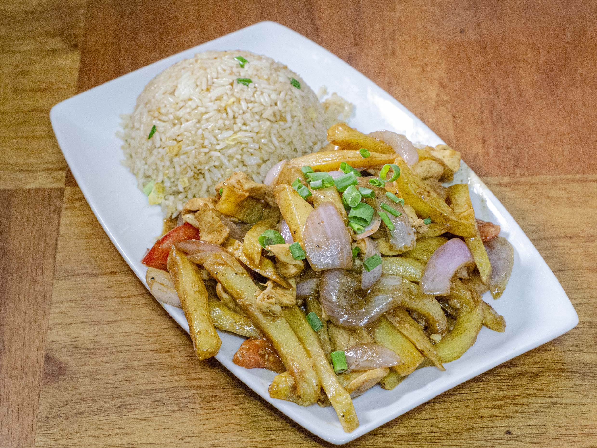 Arroz chaufa, papas fritas, cebolla criolla, tomate y pollo sancochado.