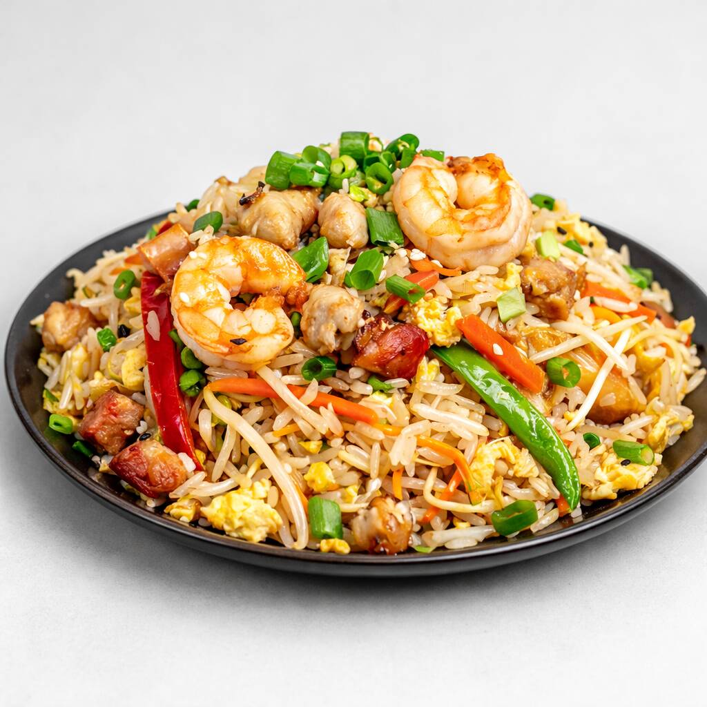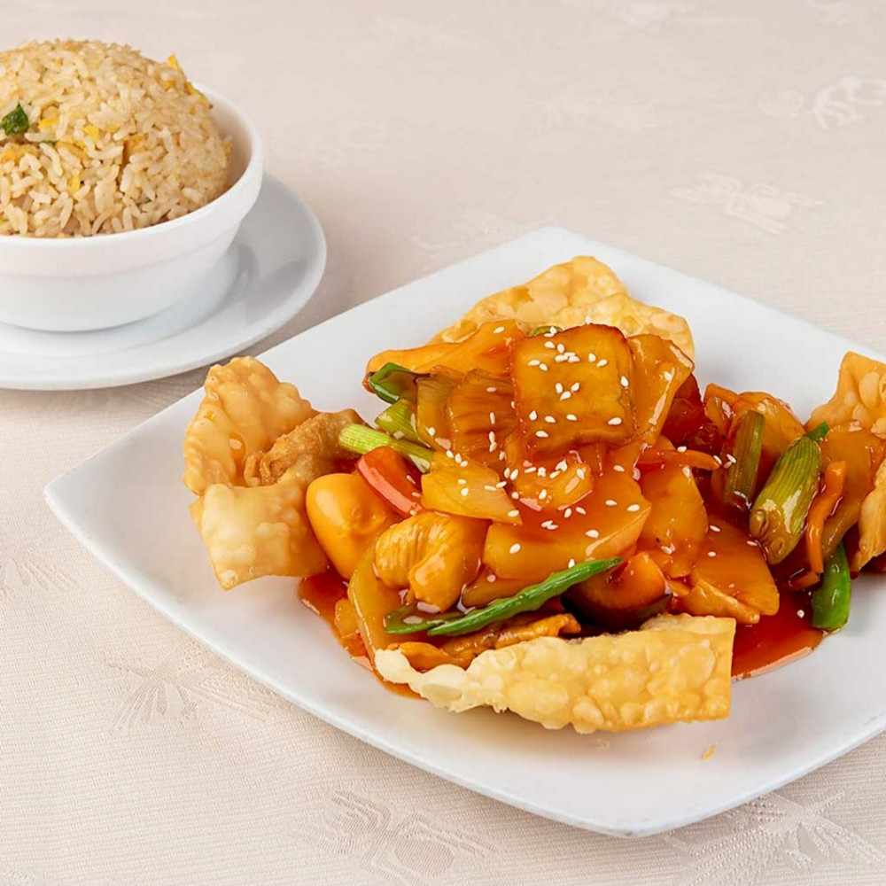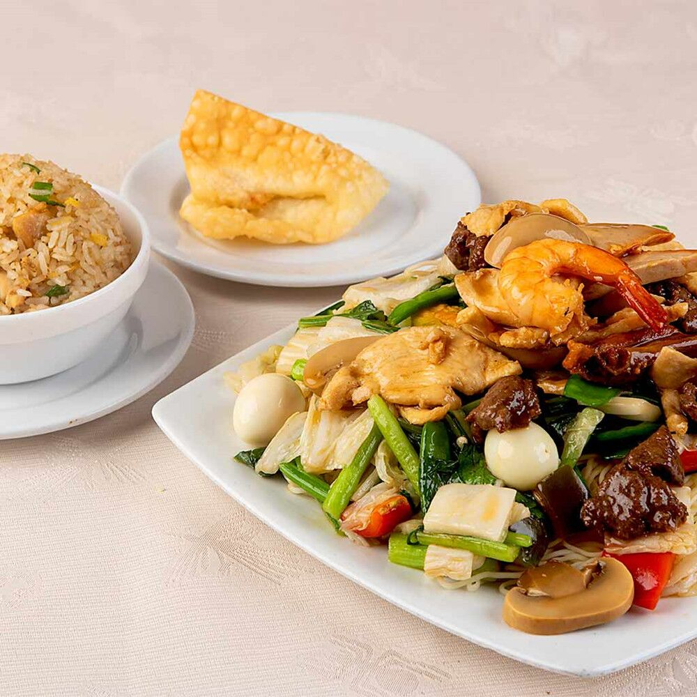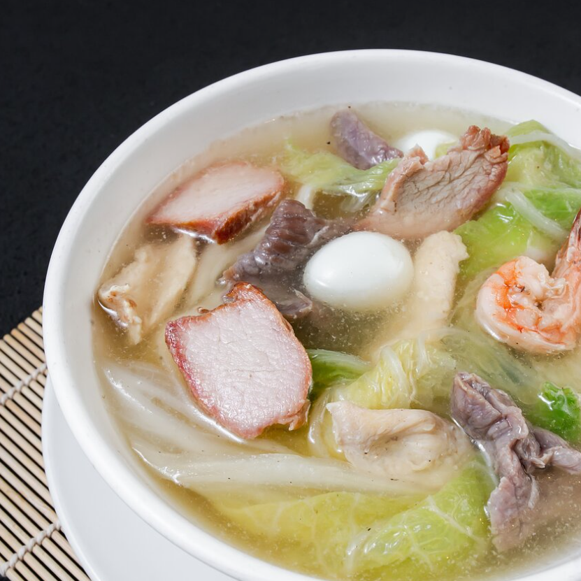 Deliciosa sopa tradicional con wantanes rellenos, pollo, chancho asado, huevo y verduras frescas. Servida con abundante caldo caliente y sabor casero.