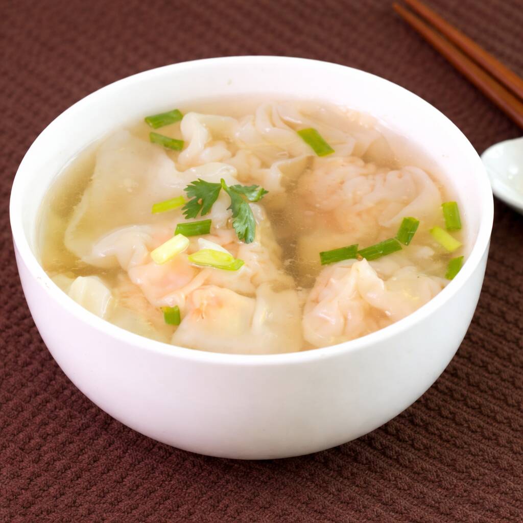 Caldo tradicional con wantanes rellenos de pollo, acompañado de verduras frescas y cebollita china