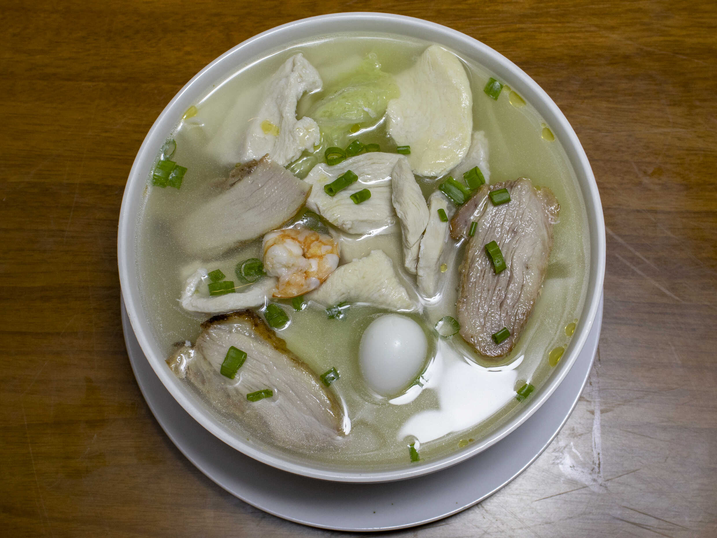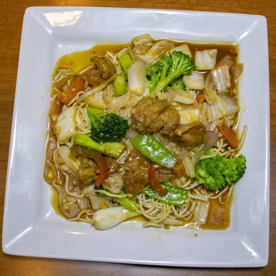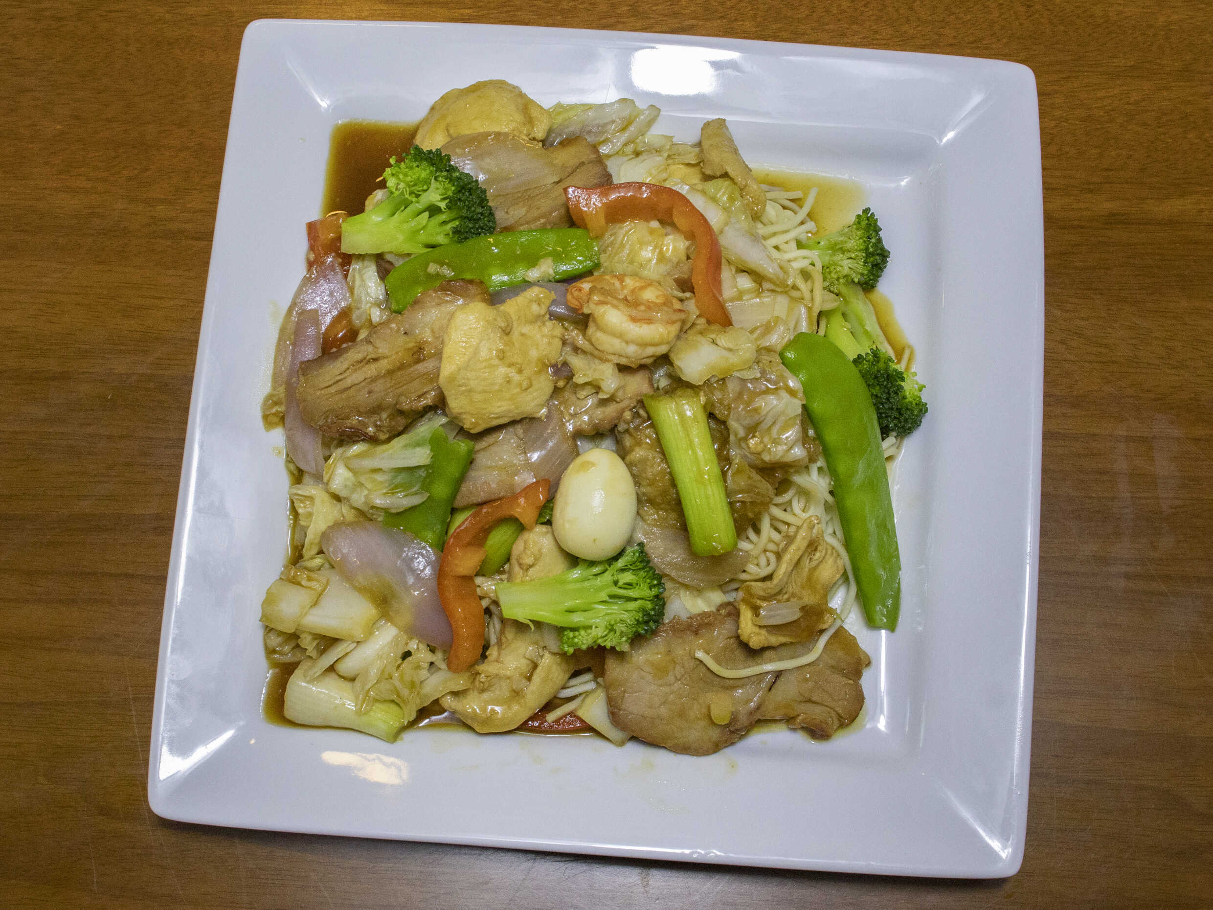 Verduras salteadas acompañadas con chancho, pollo en trozos, langostino,huevito de codorniz y wanyi, servidos en una plancha para darle ese sabor ahumado con la fusión de todo lo salteado.