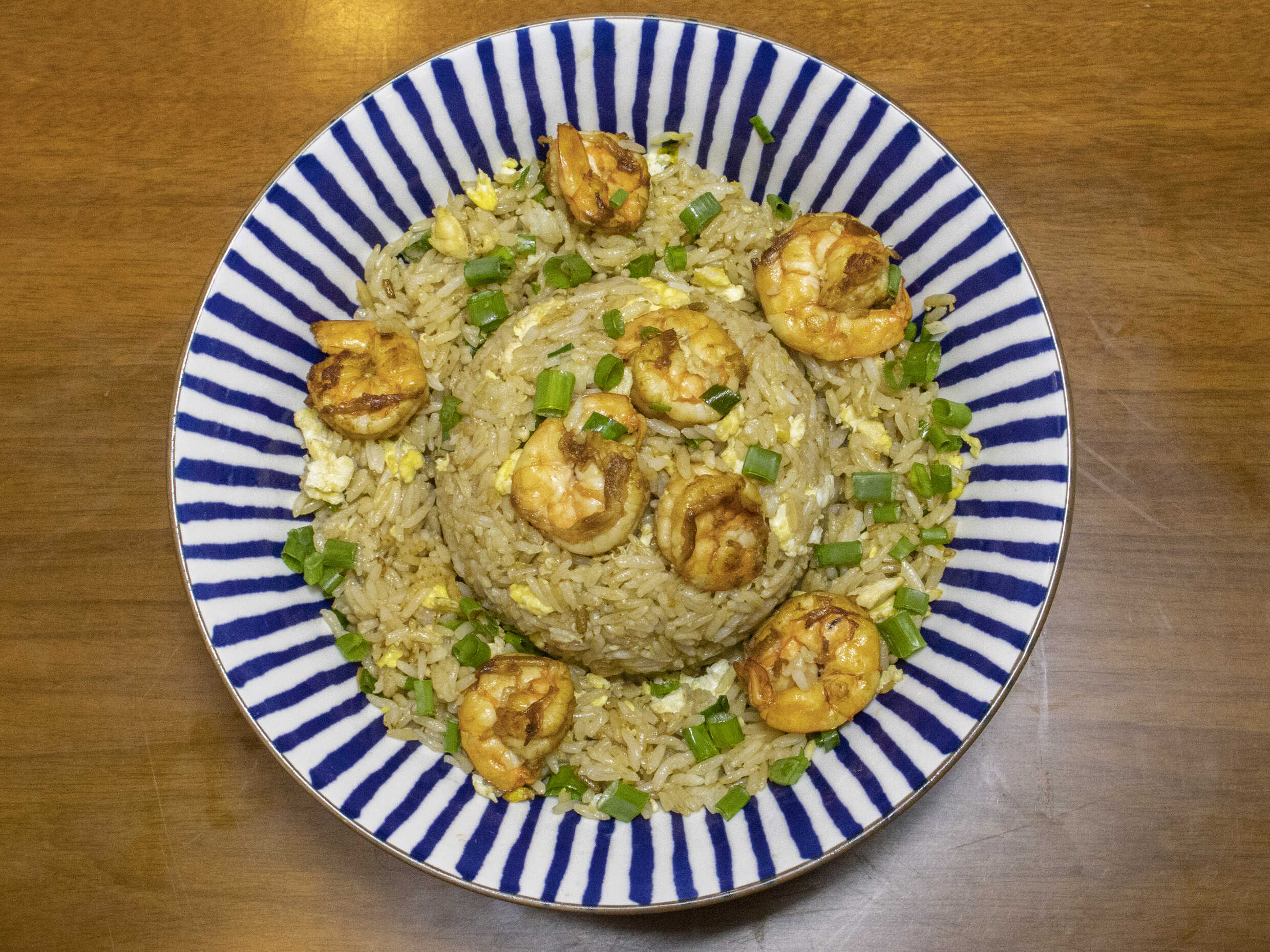 Arroz chaufa con langostinos flameados.