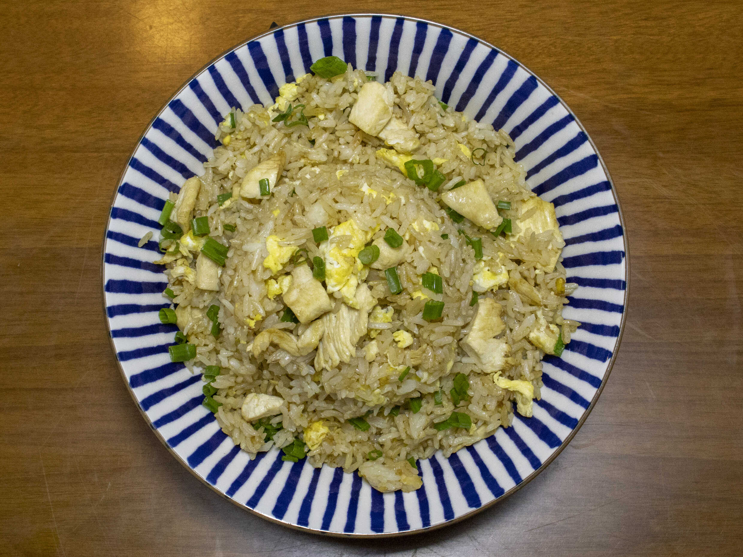 Arroz chaufa con trozos de pollo salteados.