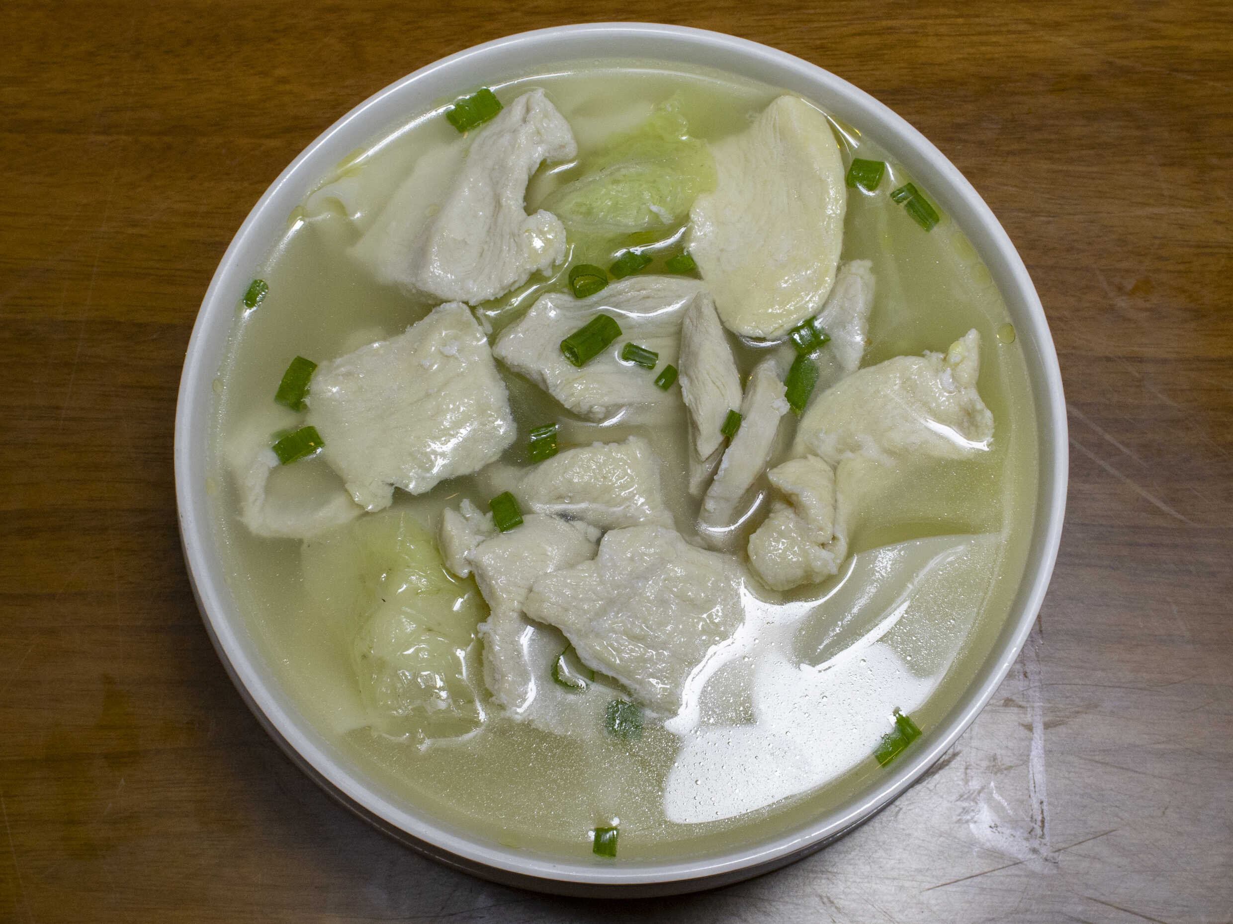 Trozos de pollo salteado con verduras chinas de temporada.