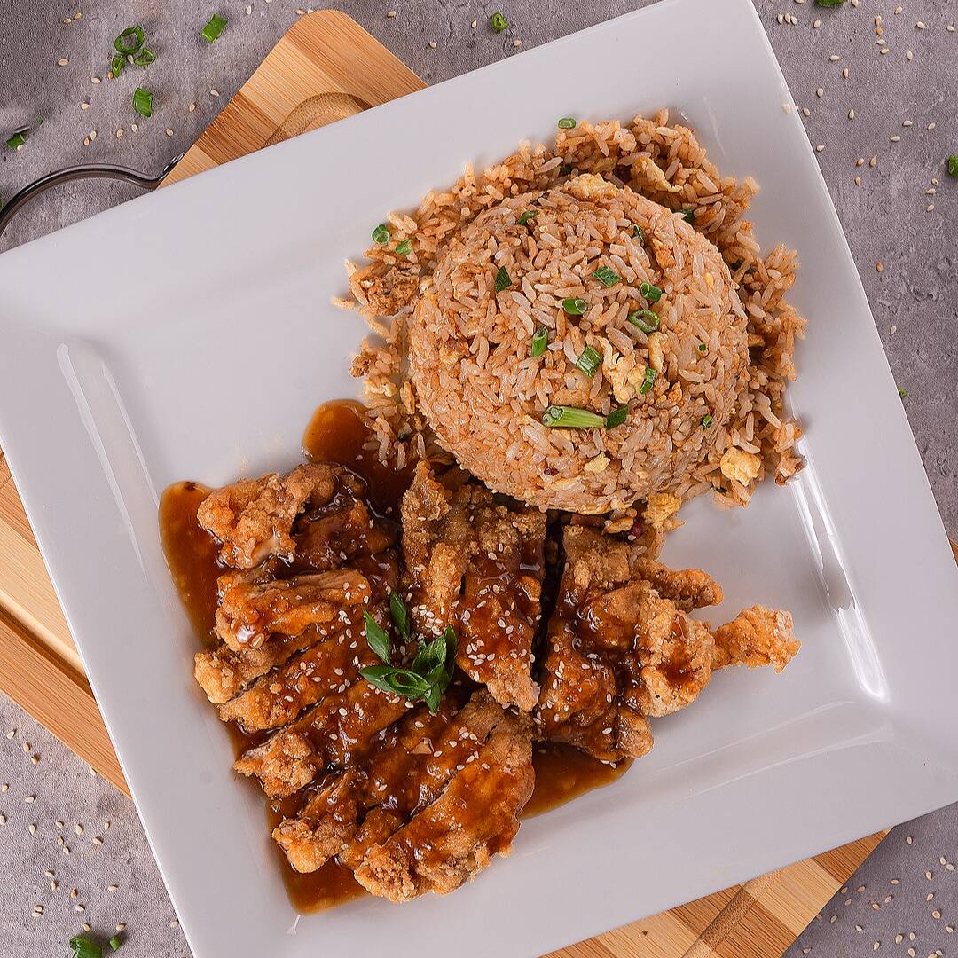 Trozos de pollo con chaufa.