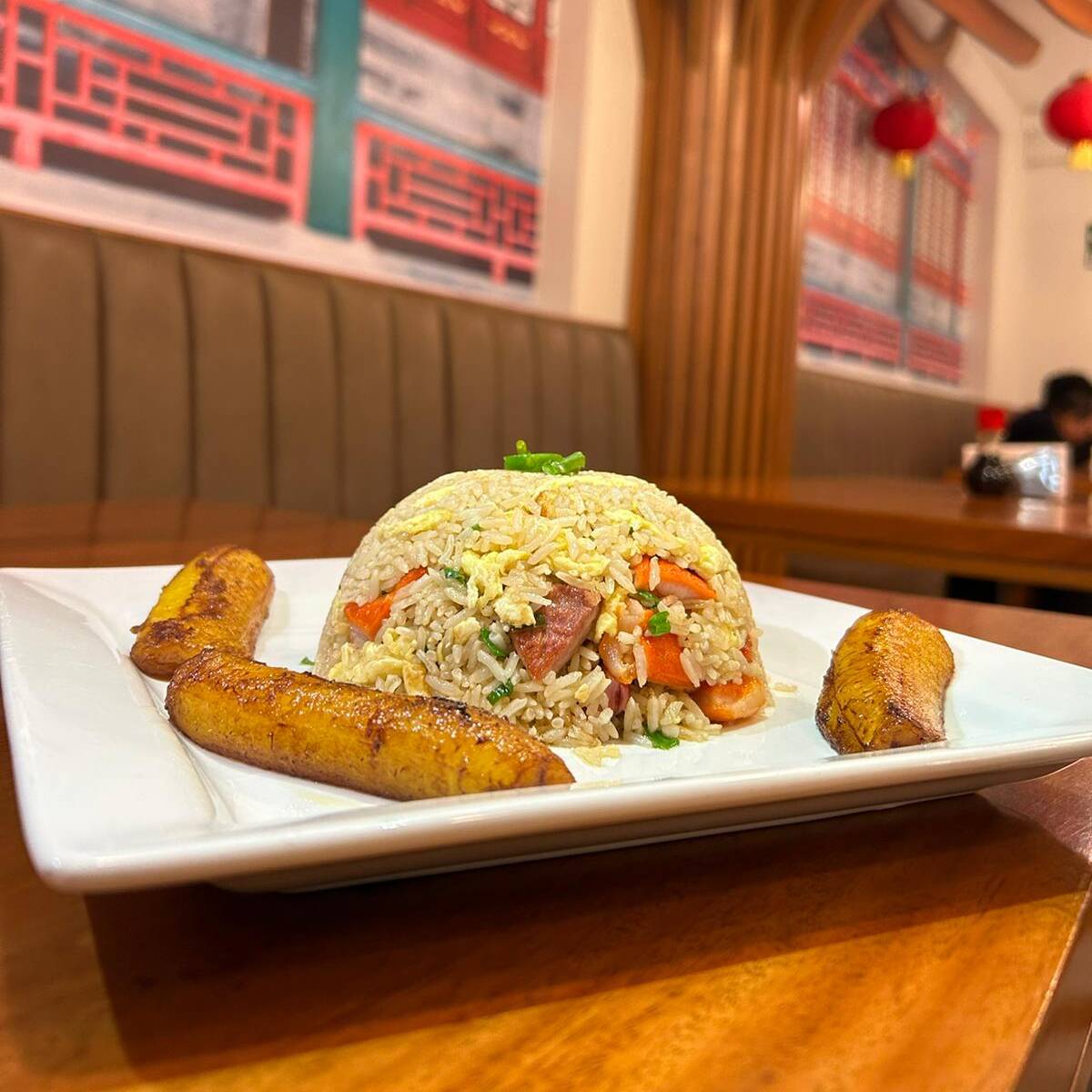 Chaufa con trozos de cecina y chorizo amazónico acompañado con plátano frito.