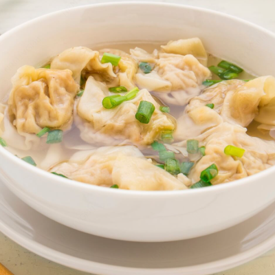 Sopa con pasta de wantán rellenas de pollo y verduras.