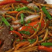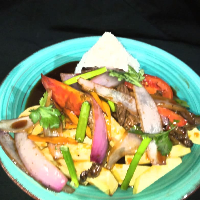 Salteado de carne, flameado con cebolla, aji, cilindro y tallarines