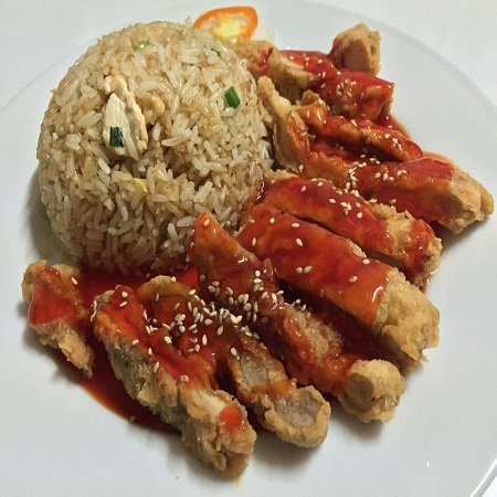 Porción de chaufa , pollo apanada en filetes pequeños con salsa de tamarindo.
