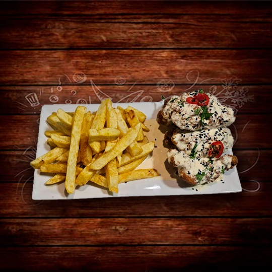 1/8 Broaster más papas fritas, ensalada y cremas.