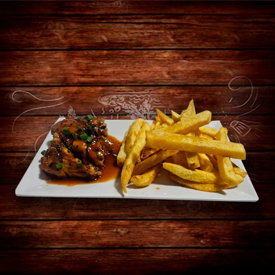 Alitas a la BBQ 6 unidades con Salsa + Papas Fritas