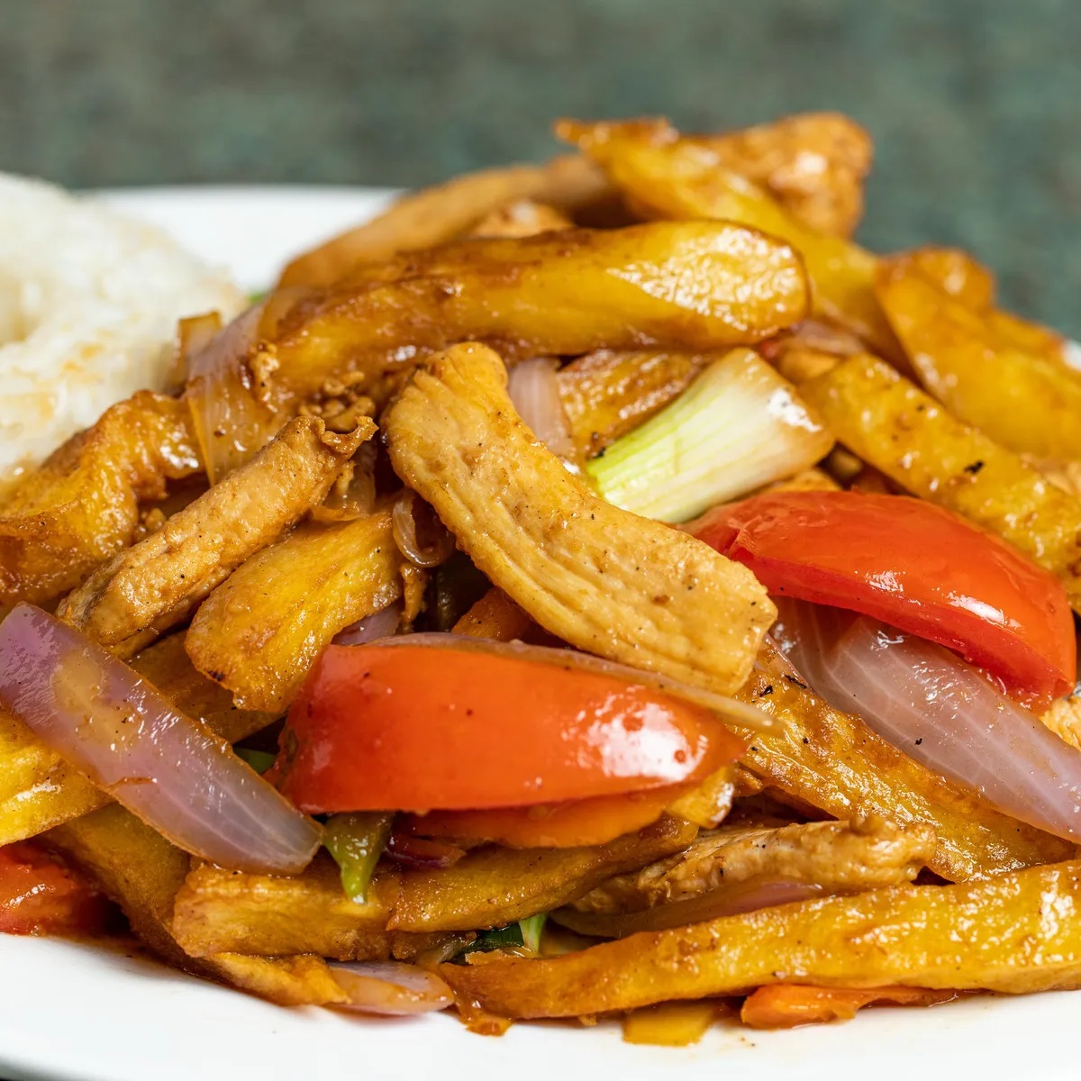 Saltado de pollo, cebolla, tomate, papas fritas y arroz blanco.