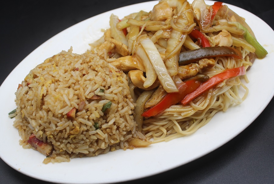 Combinado chaufa con pollo y fideos. Acompañado de sopa wantán.