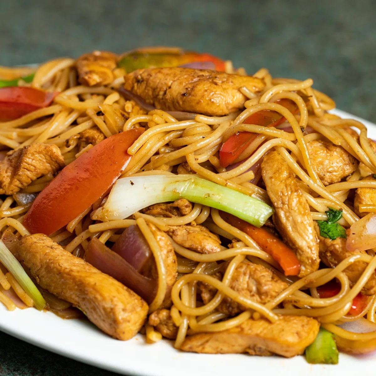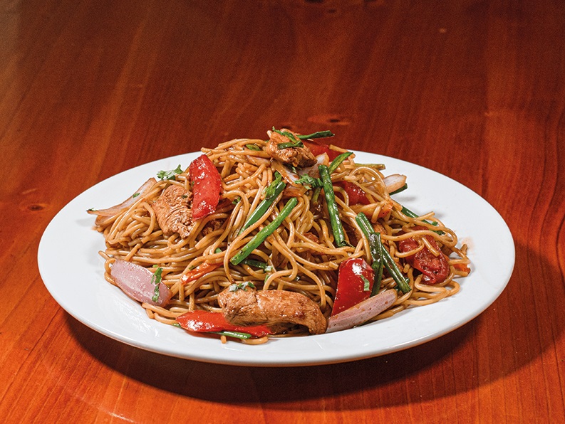Tallarín saltado con trozos de pollo y verduras, al estilo chifa.