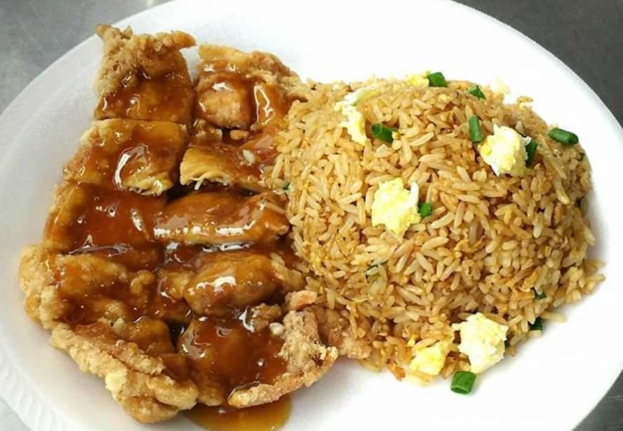 Plato salado: arroz chaufa y pollo chijaukay. Porcion personal
