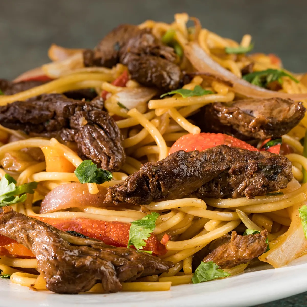Tradicional tallarín saltado de carne (tomate, cebolla, carne, ají amarillo, perejil).
