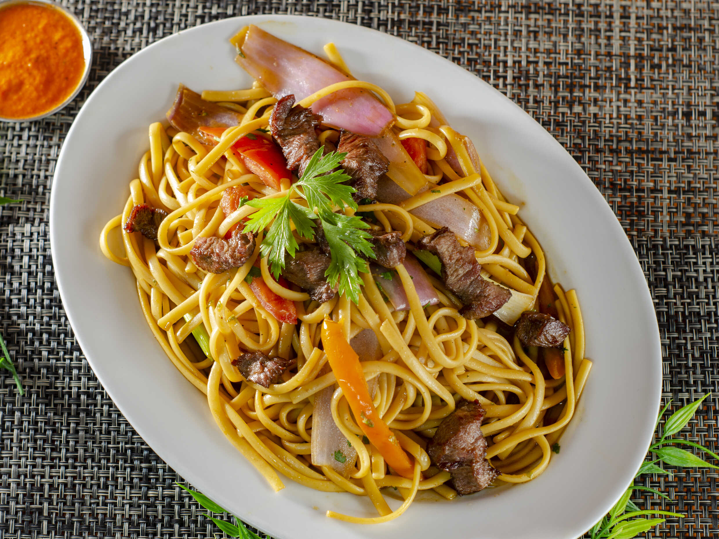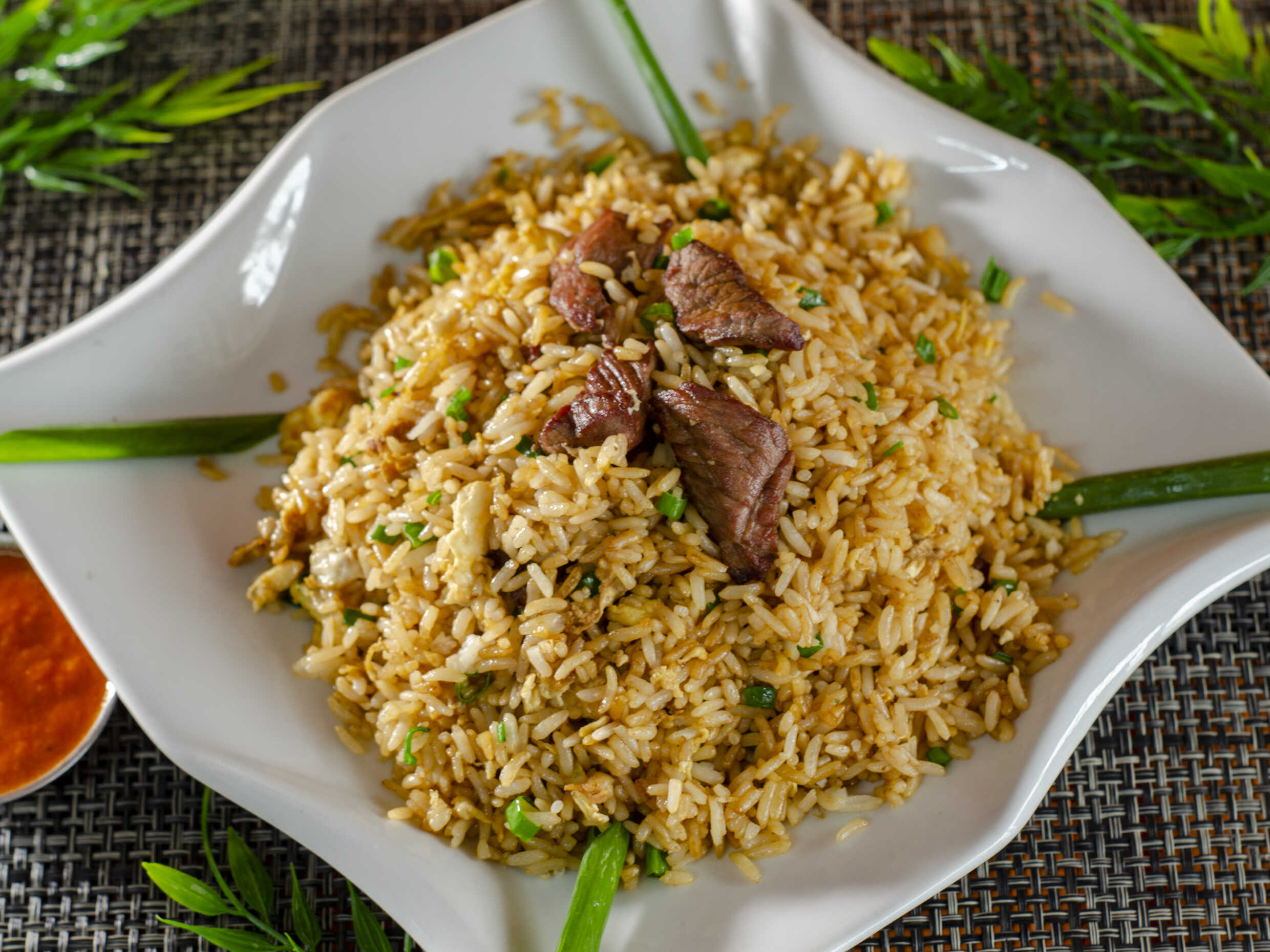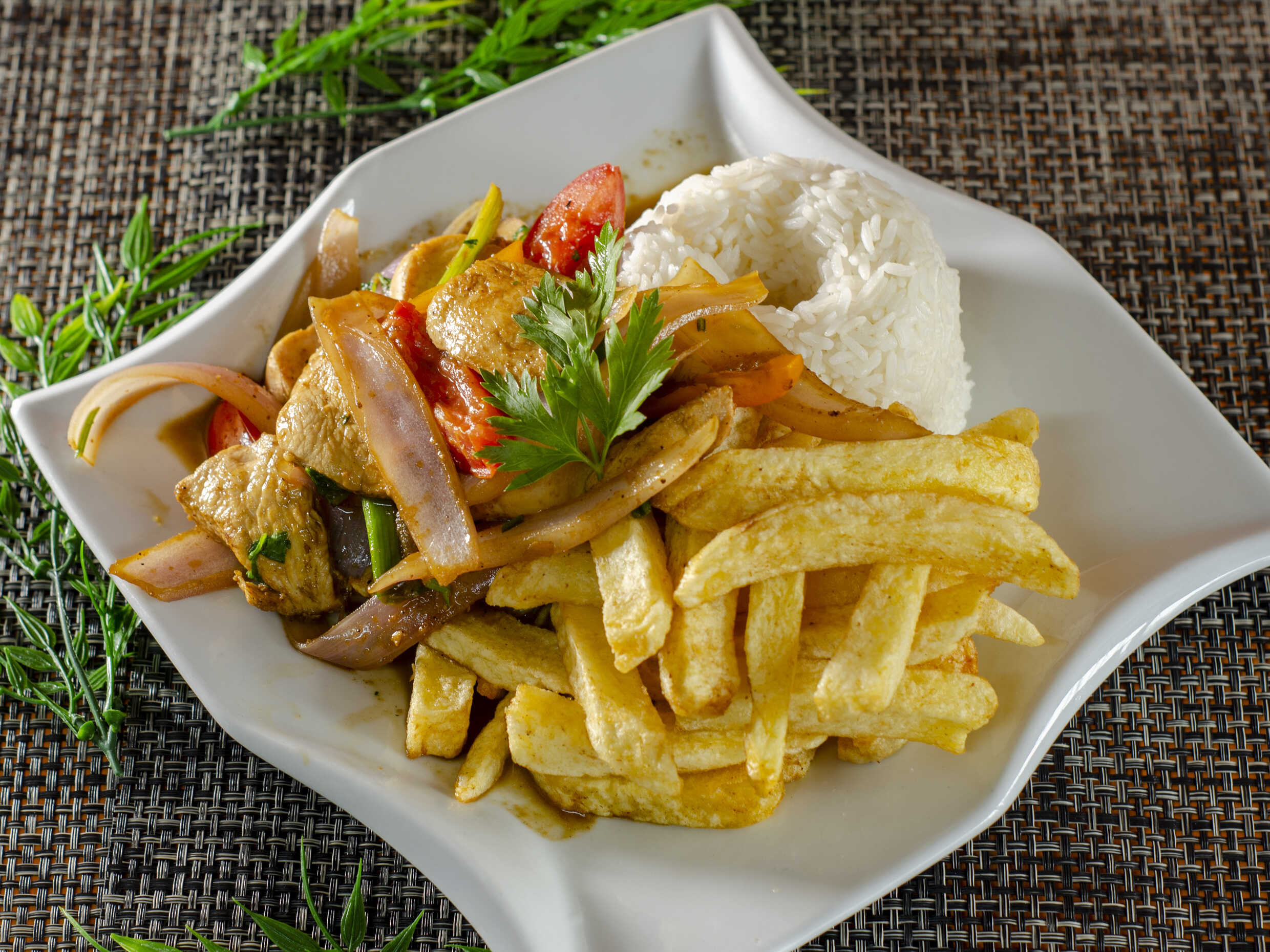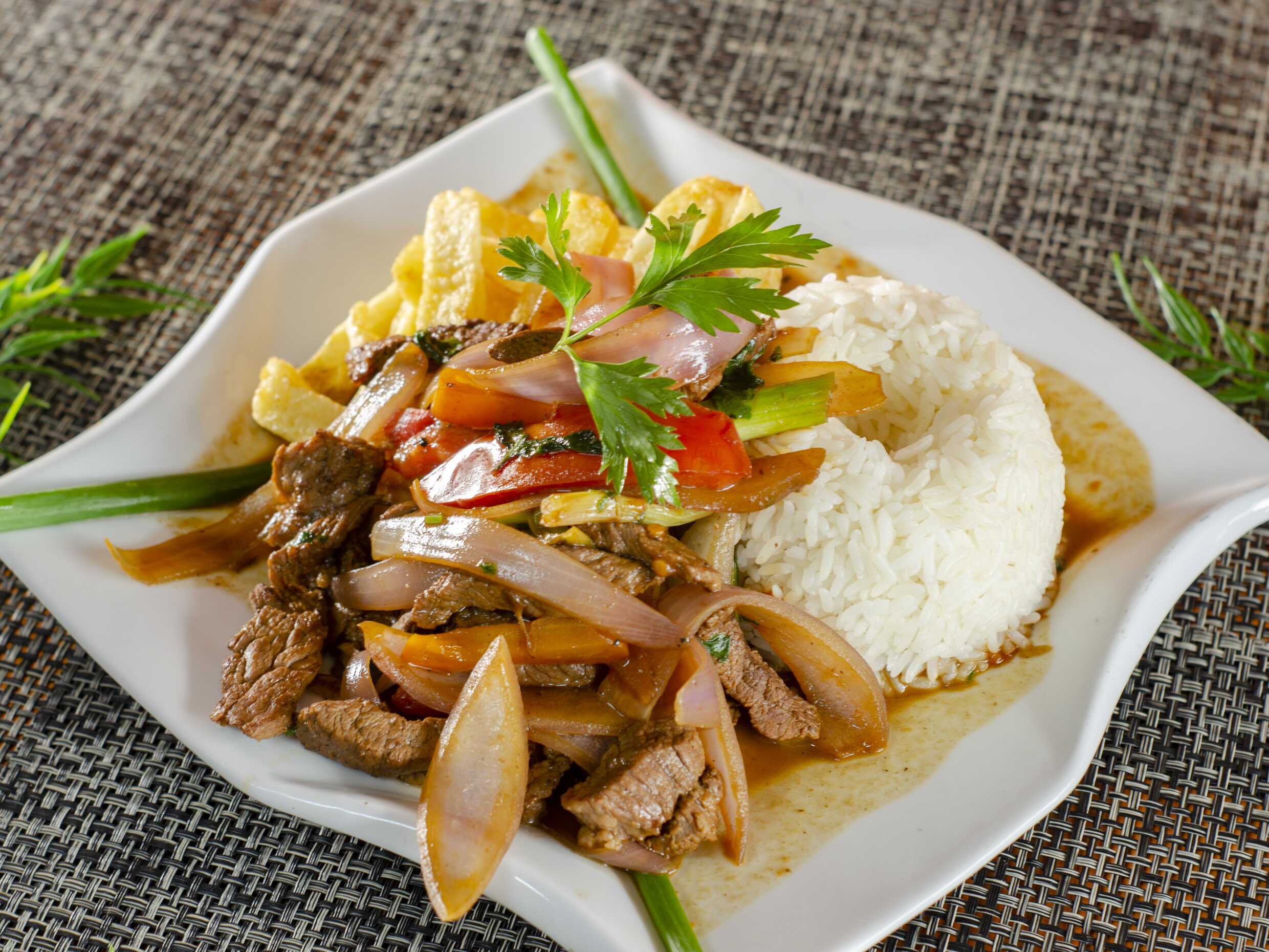 Arroz blanco y lomo saltado. cebolla ,tomate ,porción de papa chica