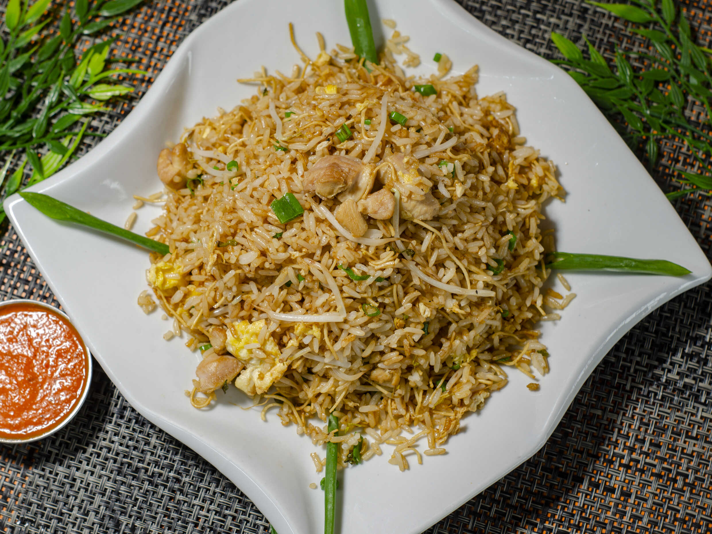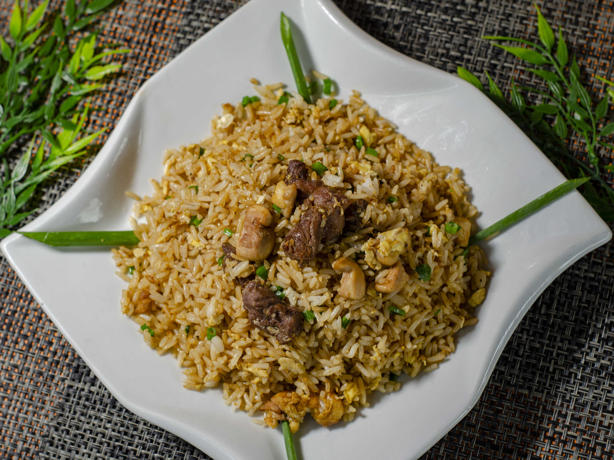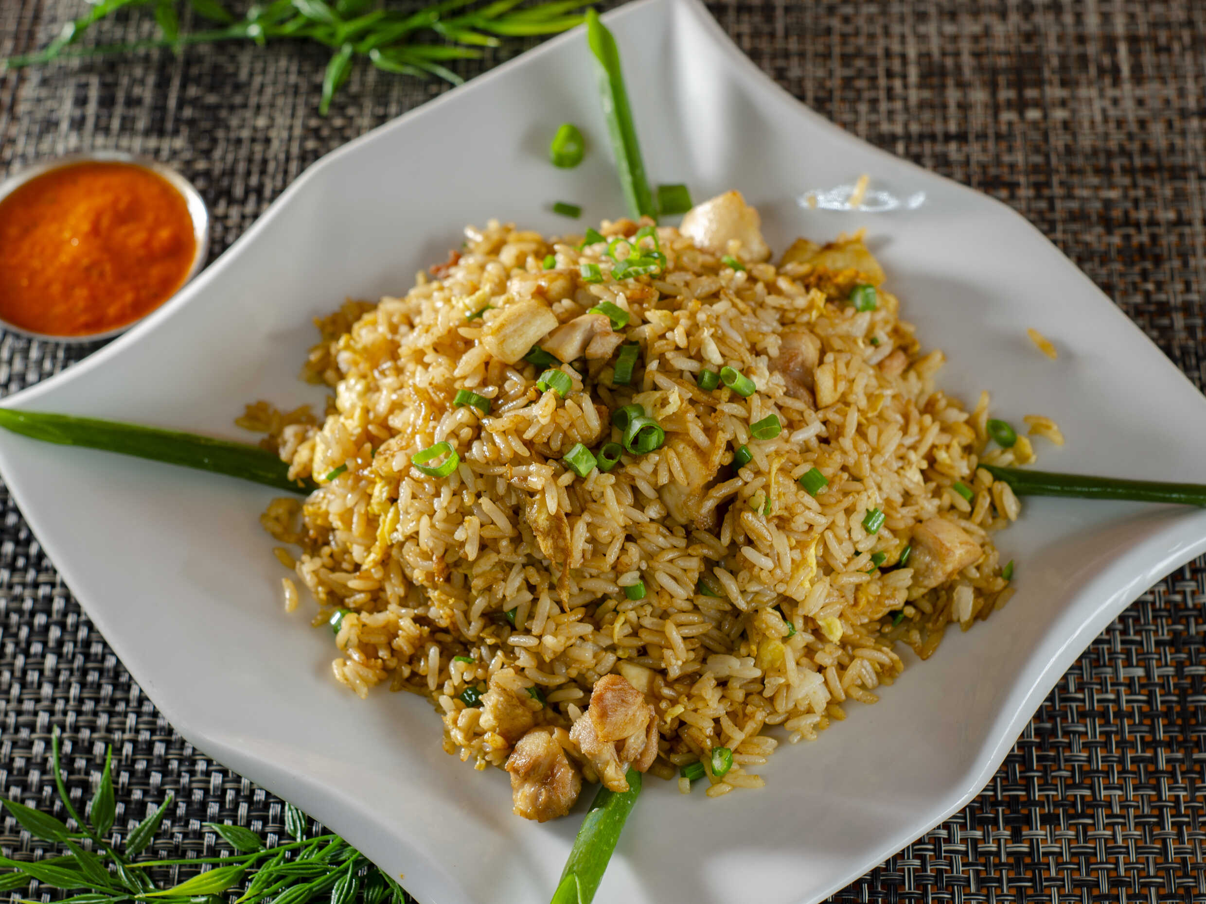 500 gramos aprox, Una porción de arroz, con huevo, tallarín, pollo cortado en cuadros pequeño y salsa