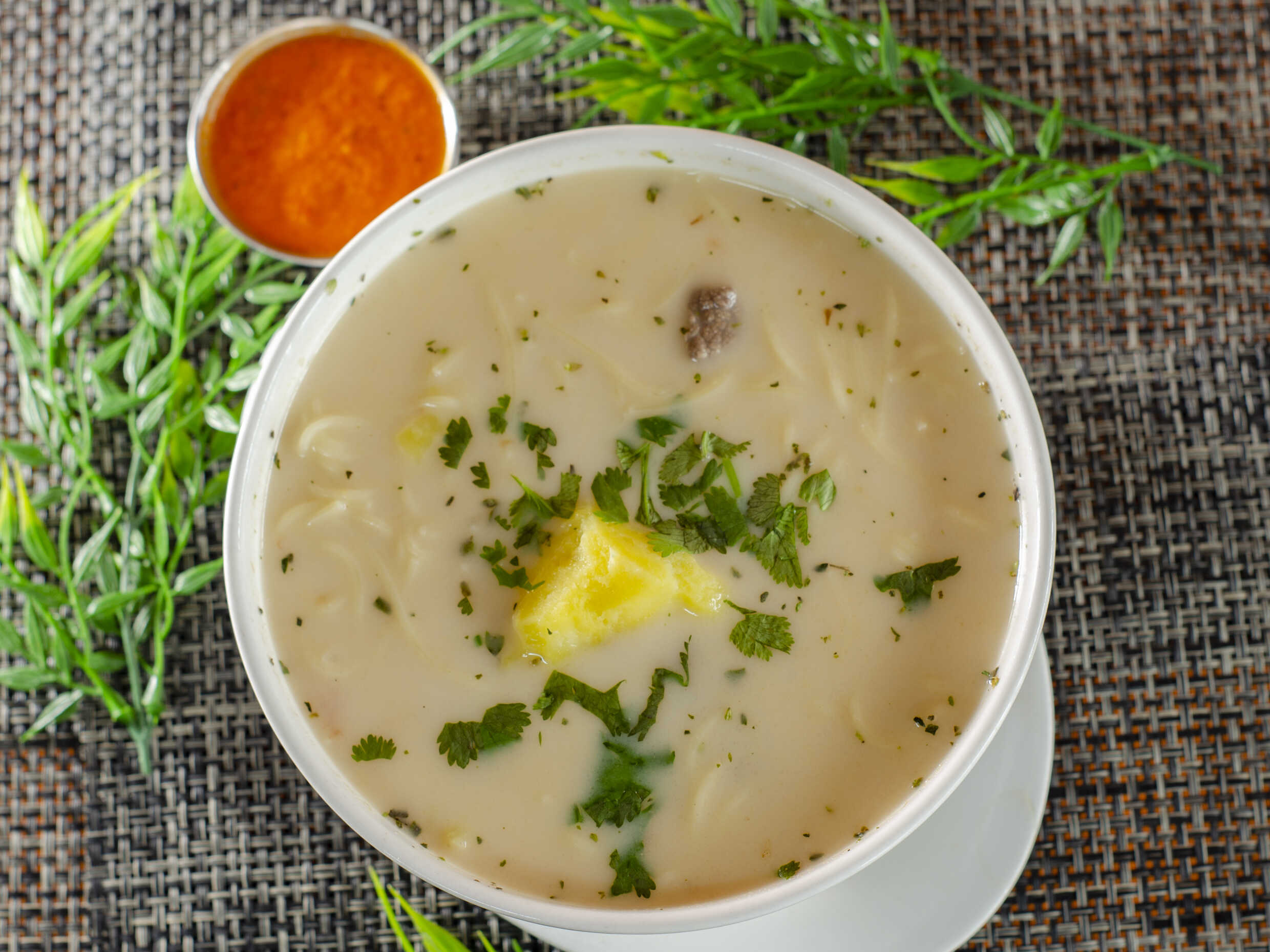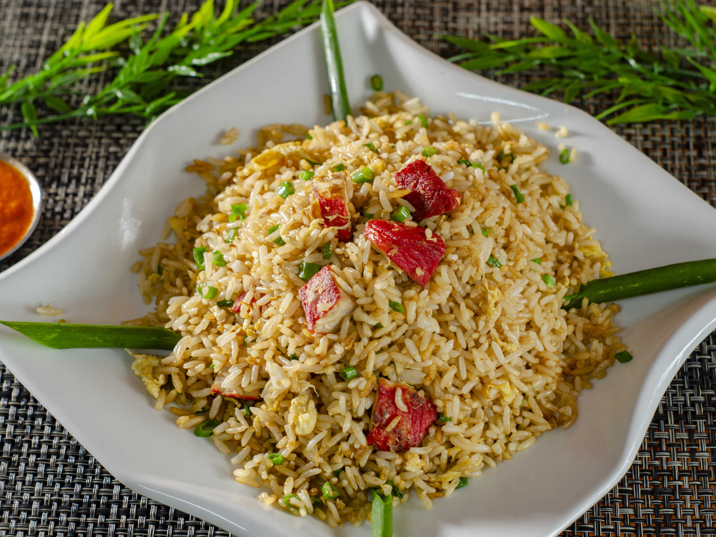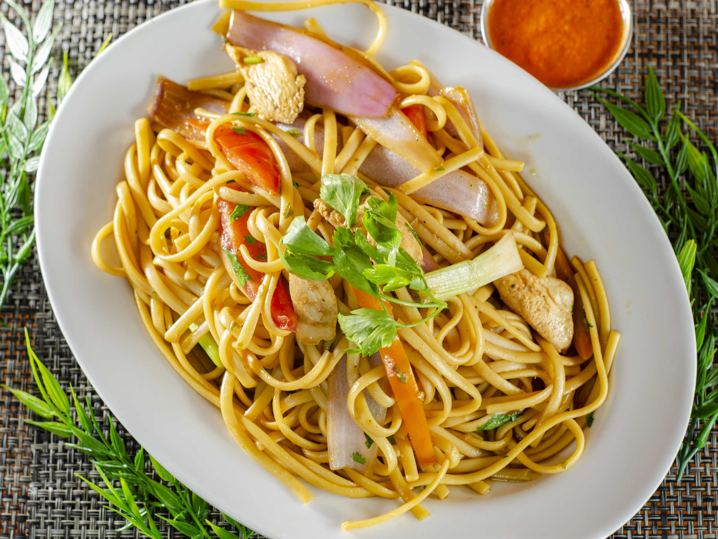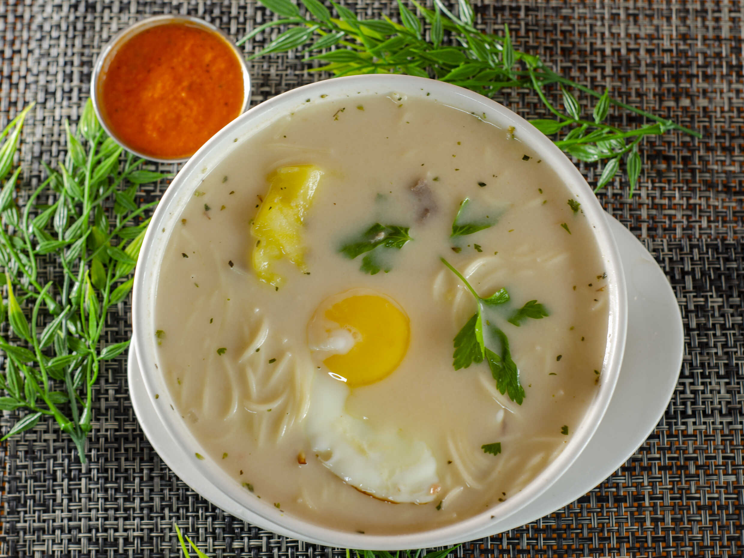 500 gramos aprox, Una porción de arroz, con huevo, tallarín, pollo cortado en cuadros pequeño y salsa