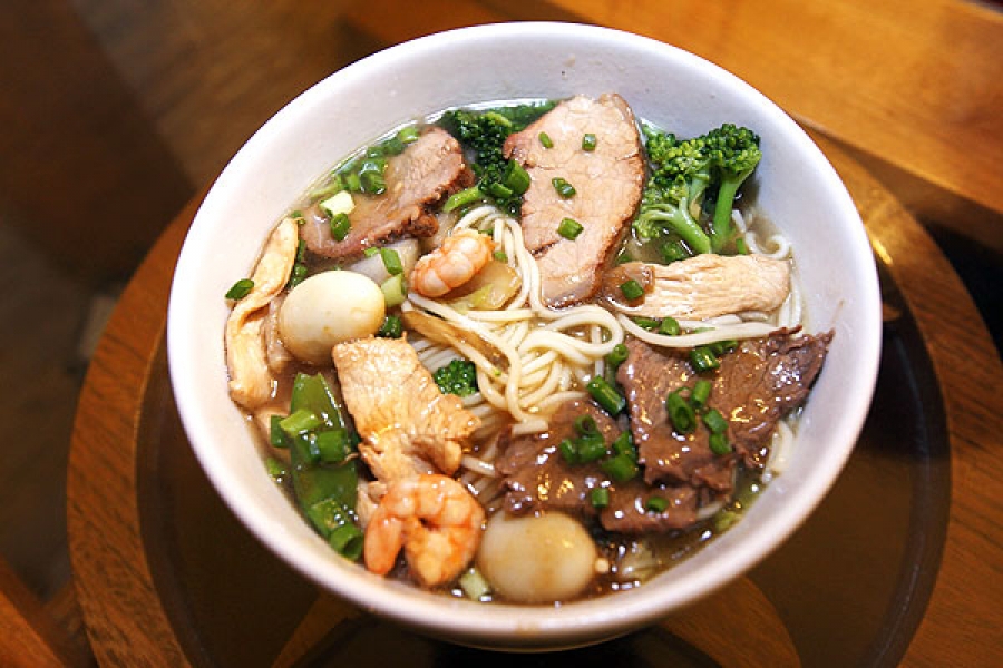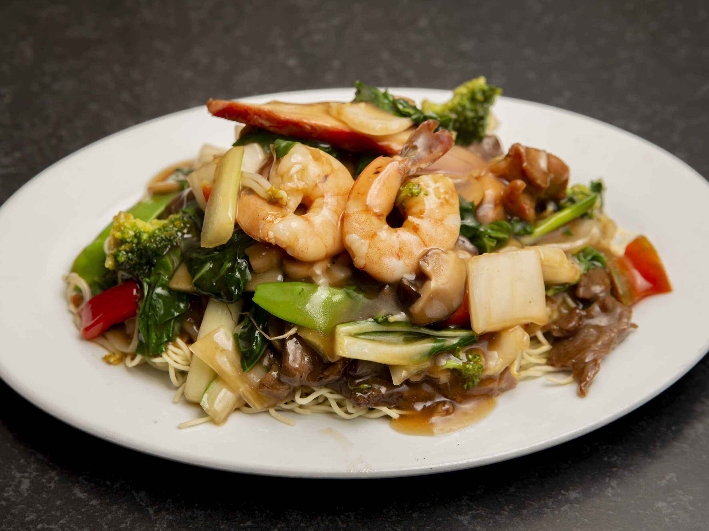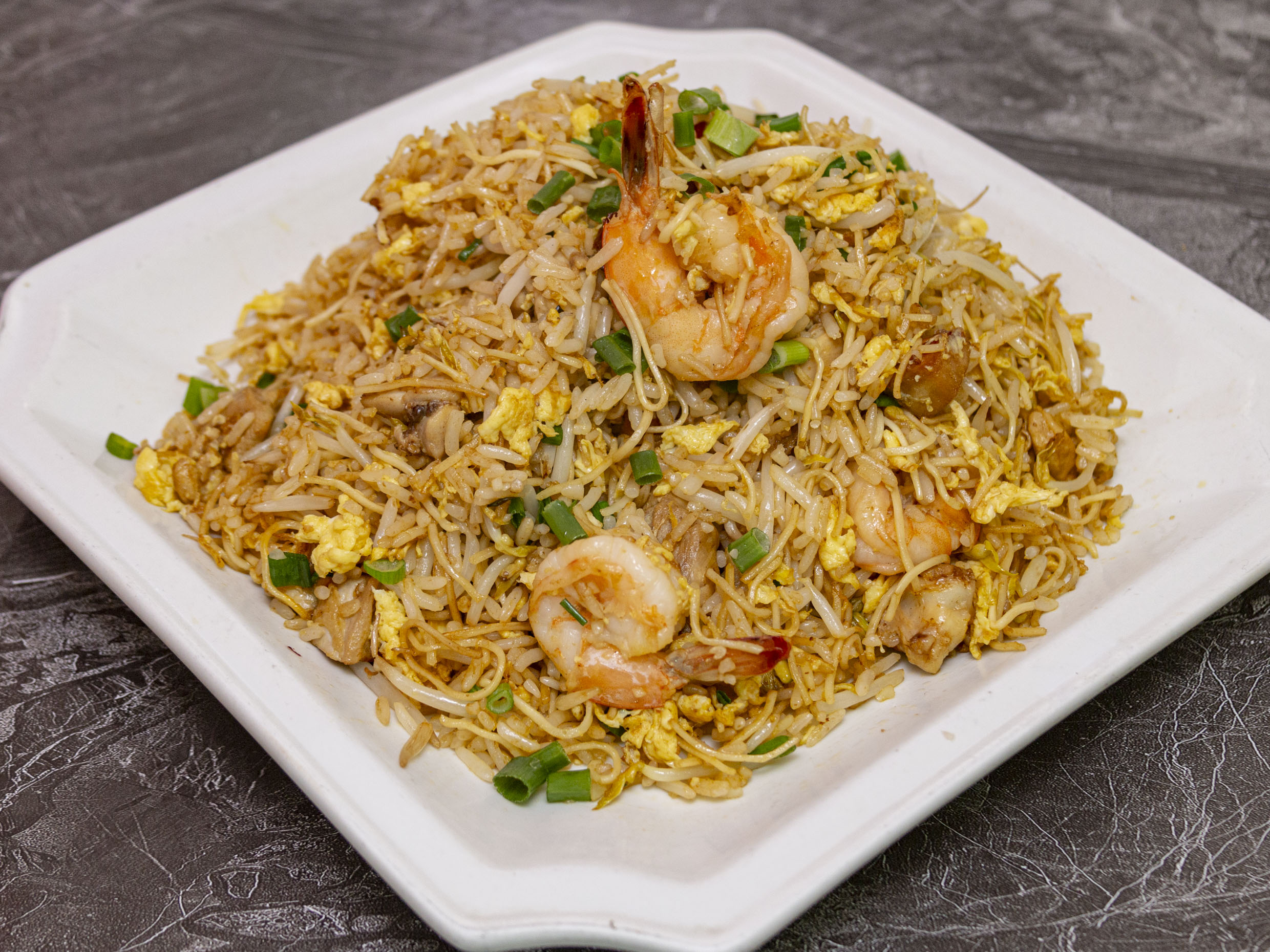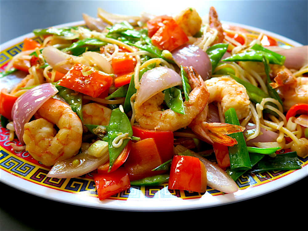 Tallarines con chancho, pollo, langostinos y verduras.