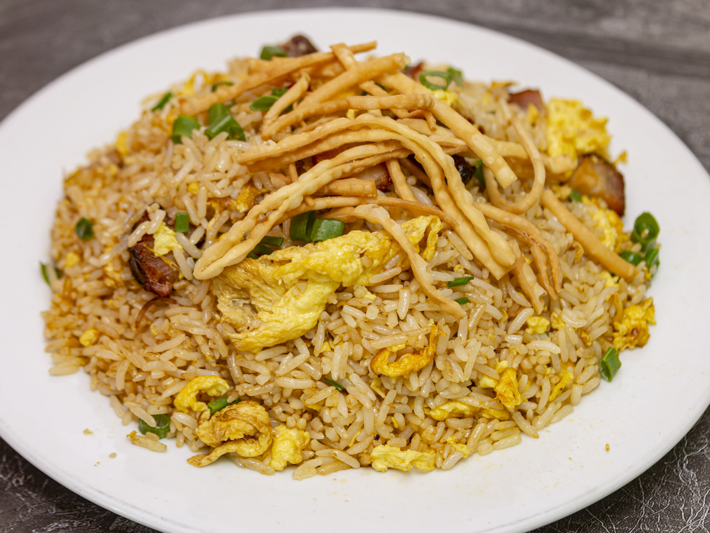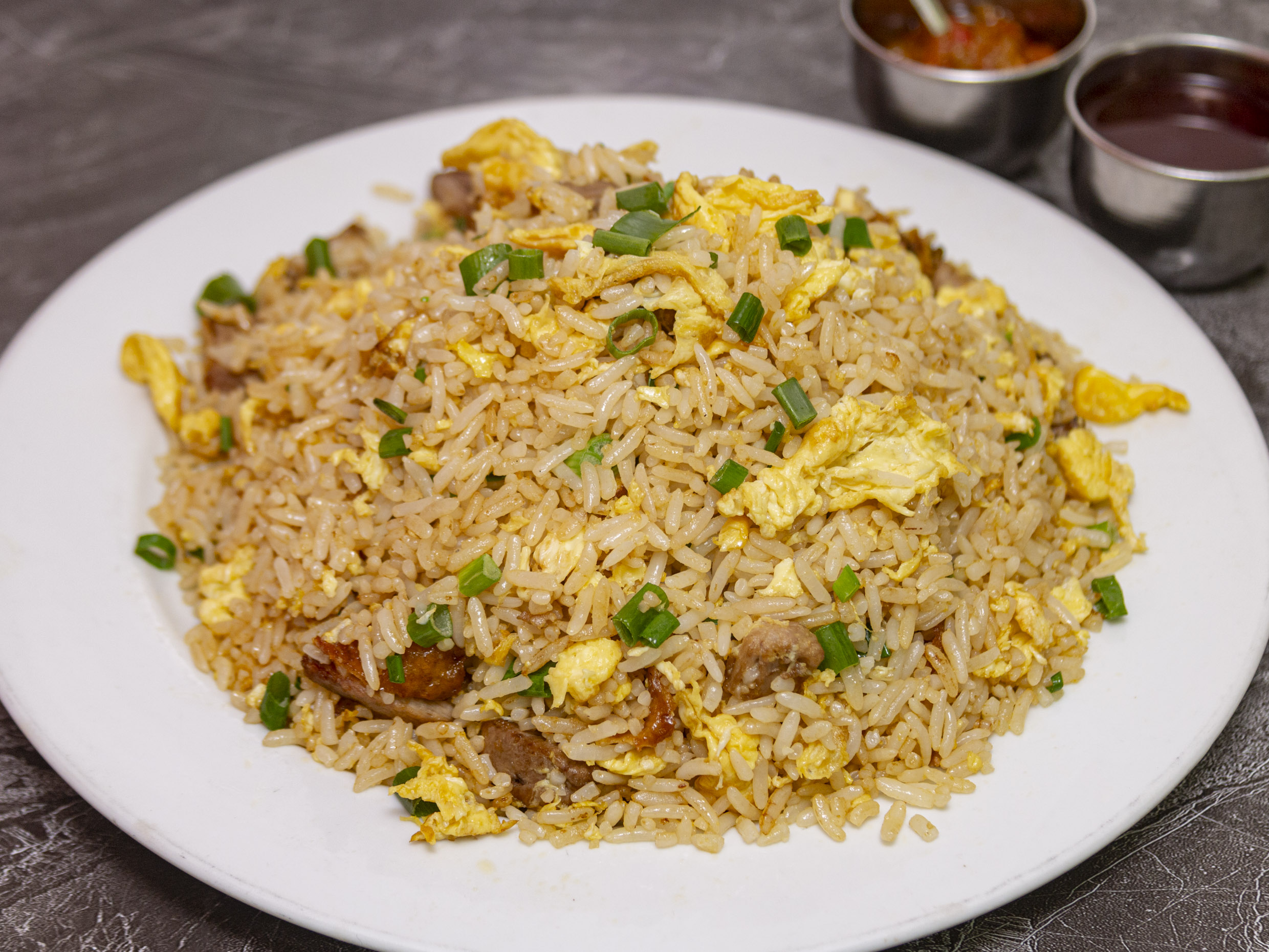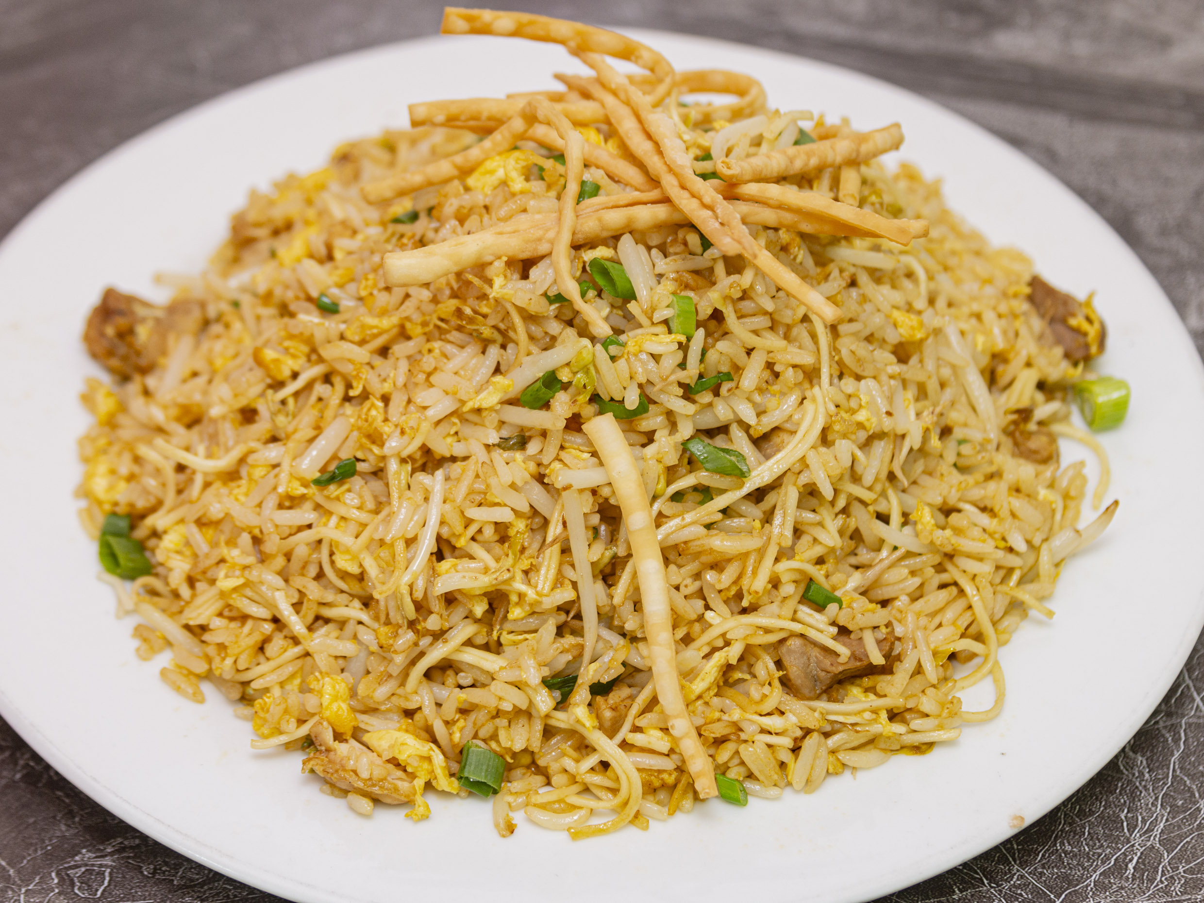 Arroz chaufa con trozos de chancho y pollo.