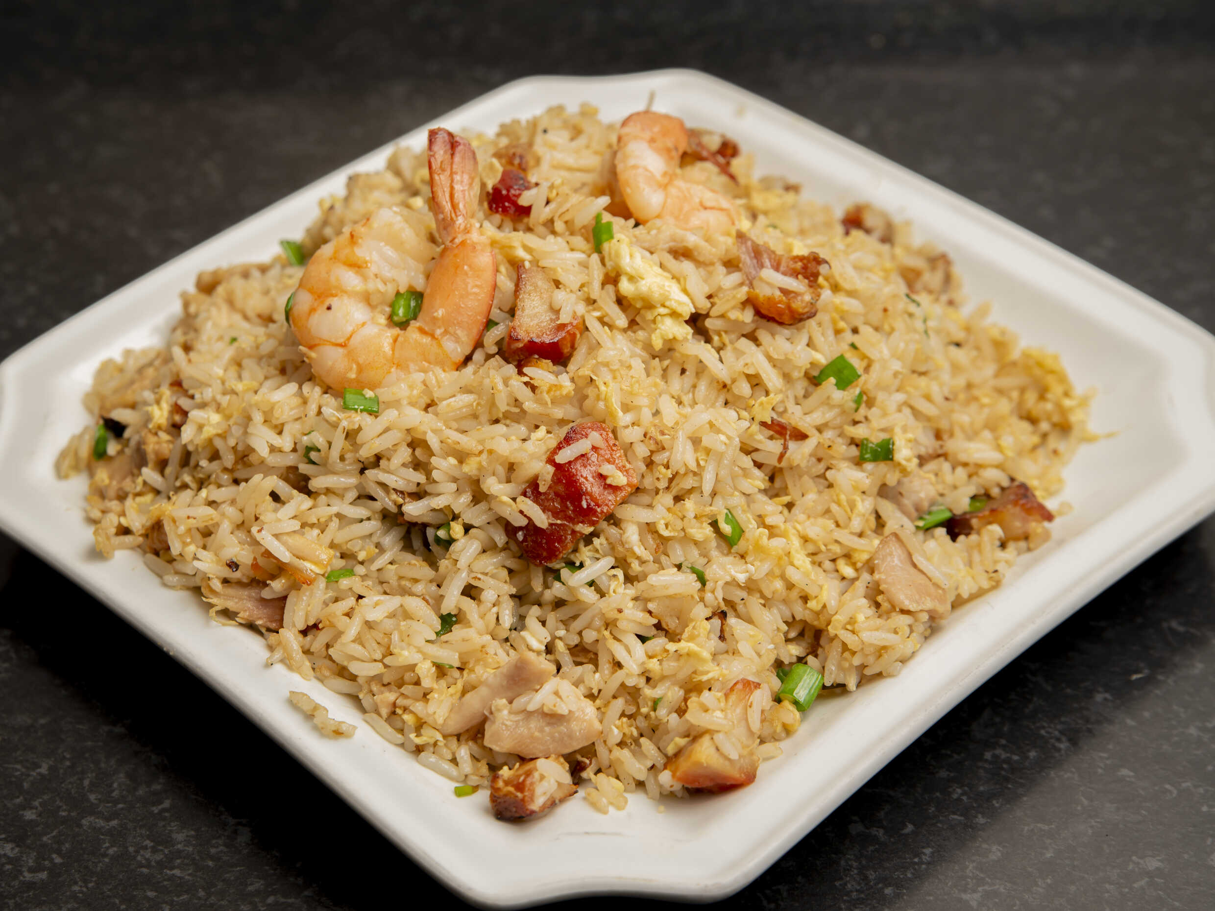Arroz chaufa con mezcla de carnes.