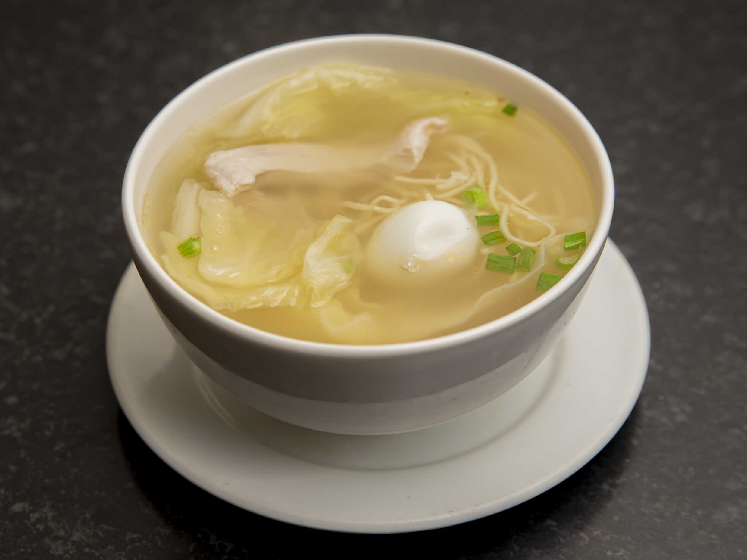 Sopa womin con pollo, tallarines, col china y huevo de codorniz.