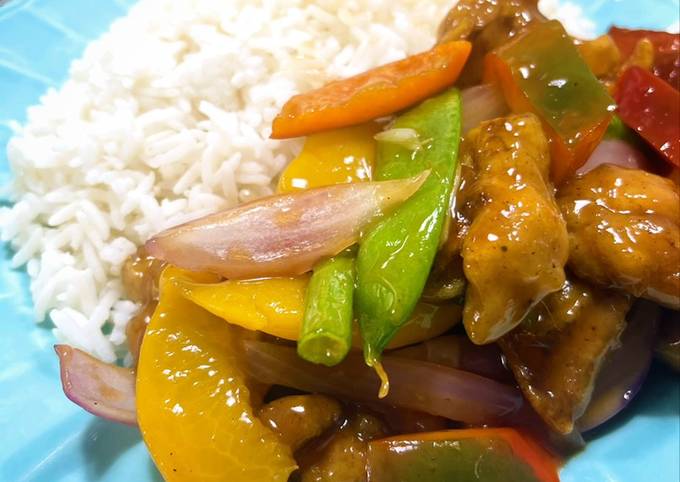 Pollo con Durazno acompañado de arroz chaufa.