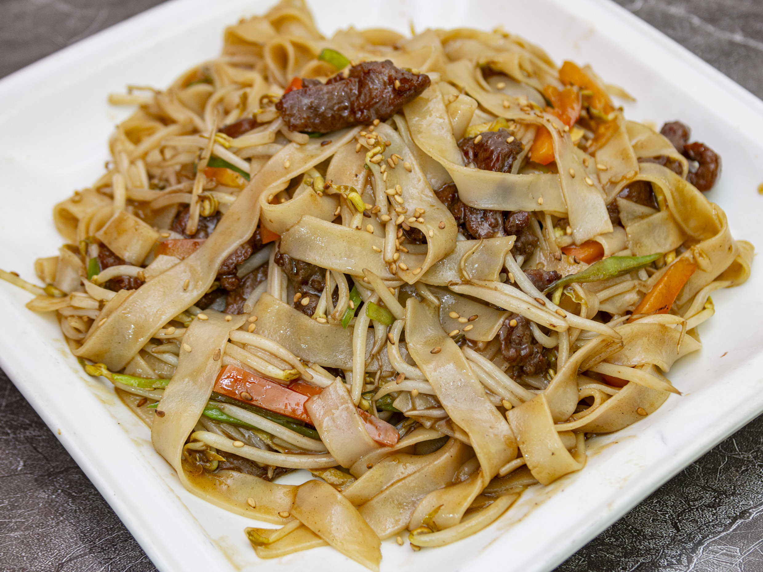 Pasta hecha de arroz salteada con carne y un poco de verduras.