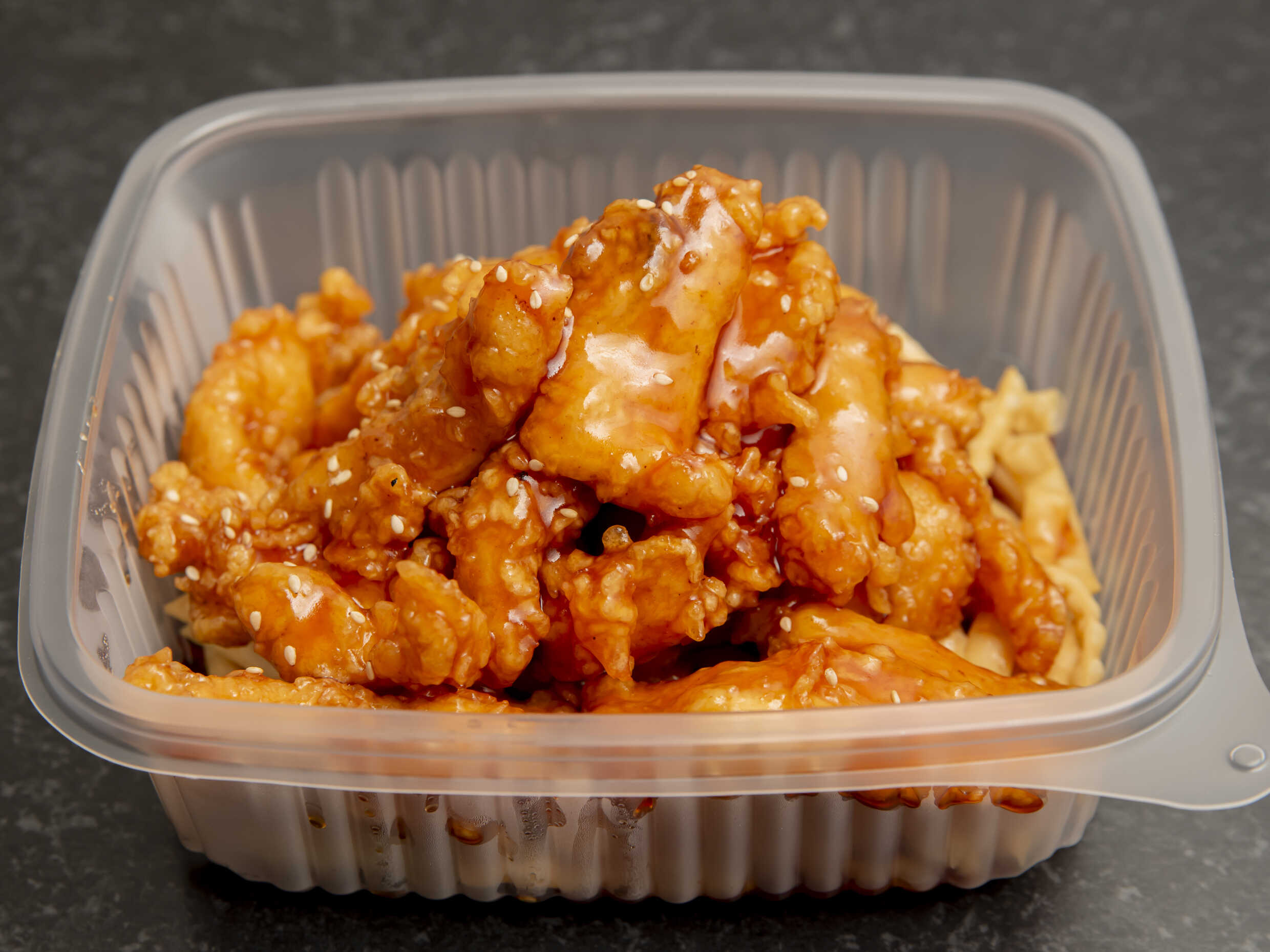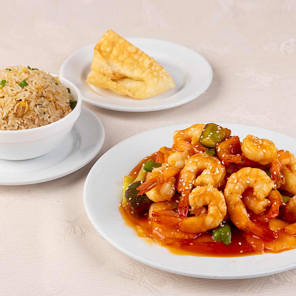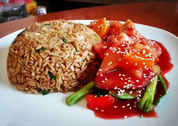 Arroz chaufa y kam lu wantan.