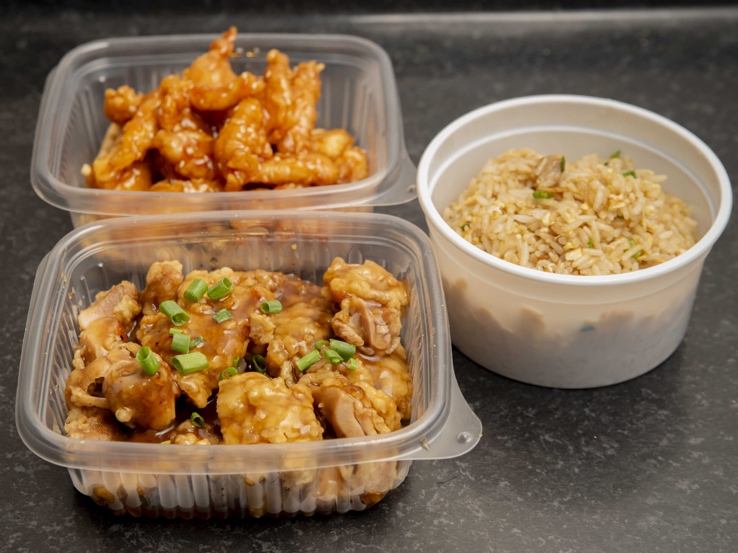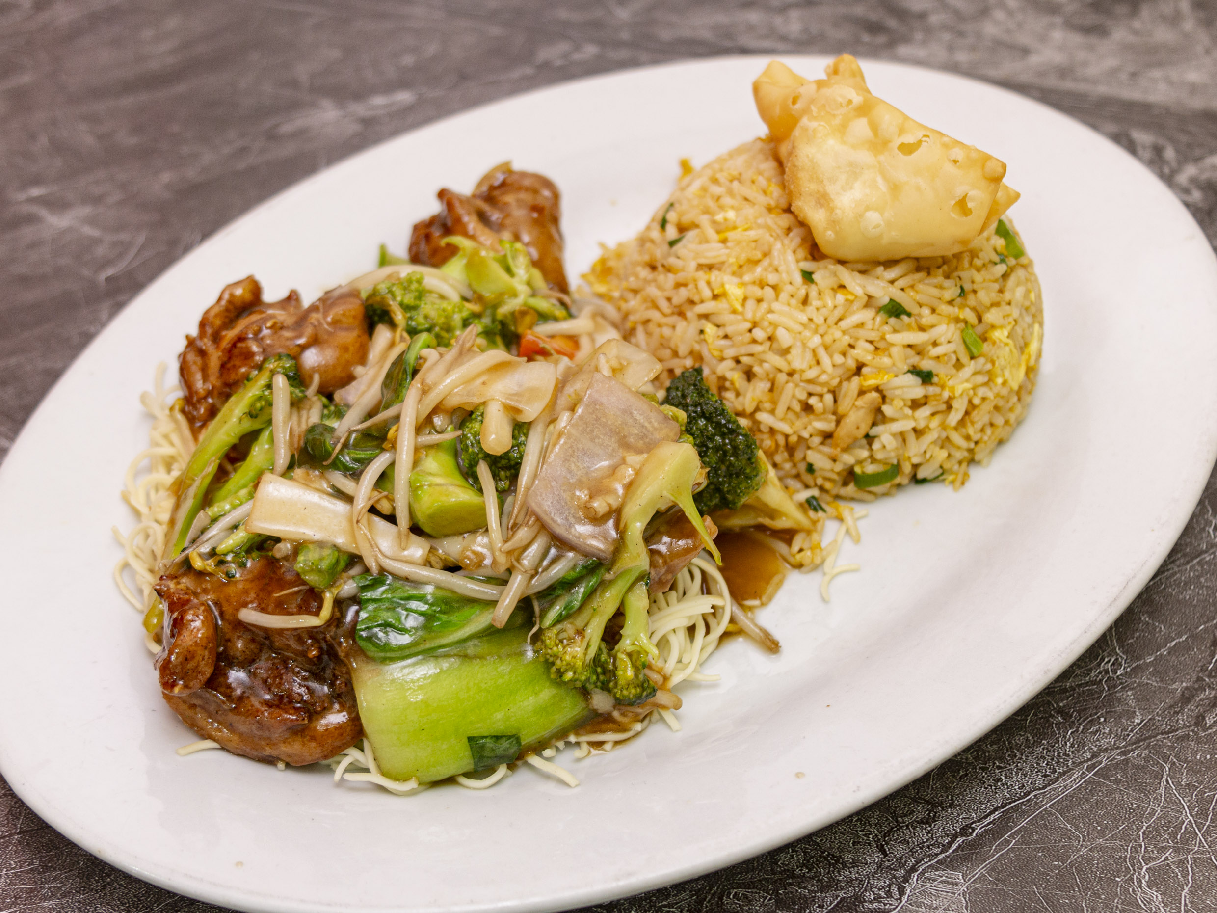 Pollo chijaukay con arroz chaufa.
