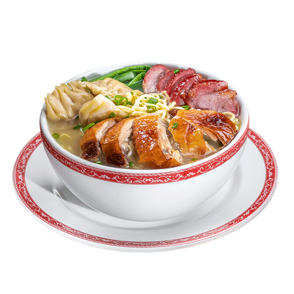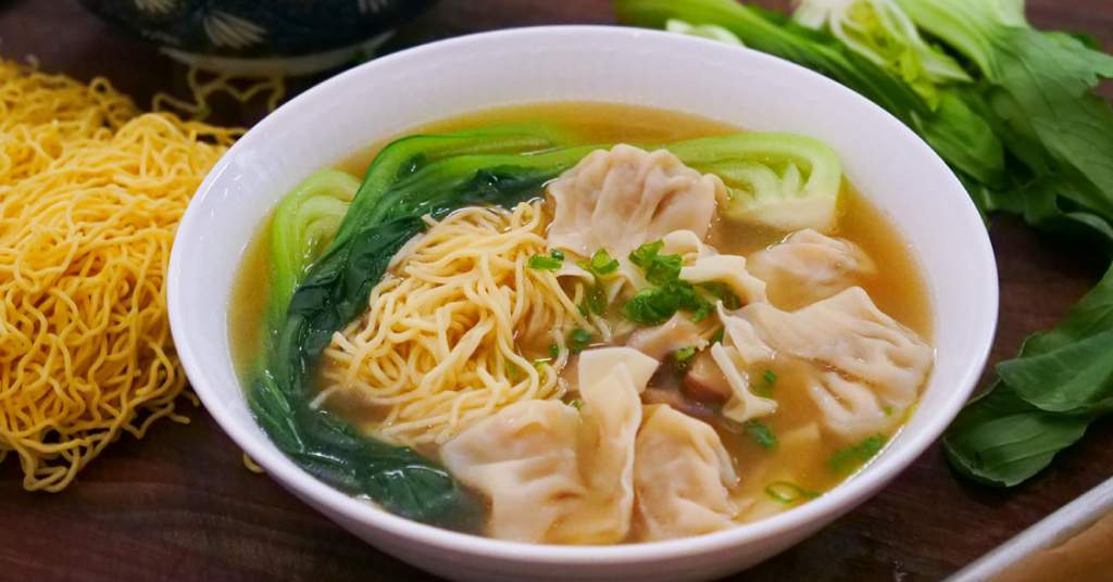 Sopa wantan con pollo, tallarines y col china.