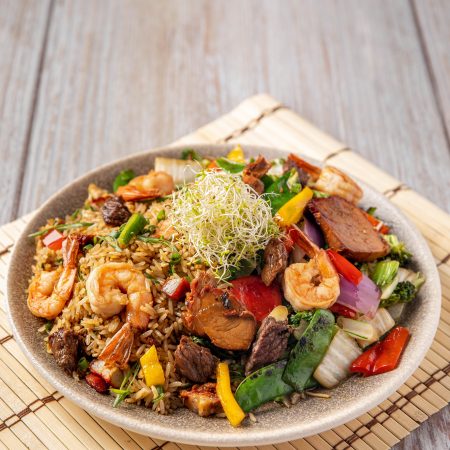 Langostino salteado con verduras acompañado de arroz chaufa.