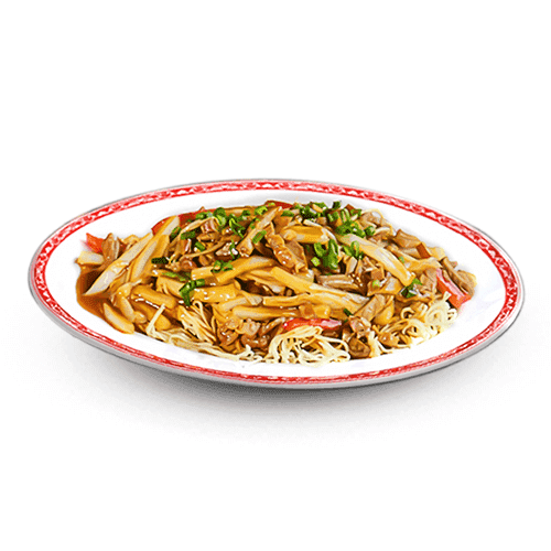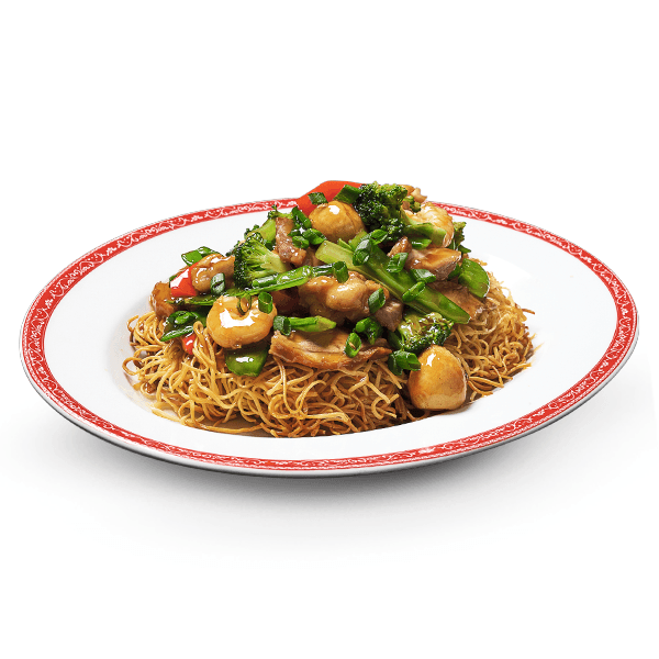 Tallarines con un mix de carnes y verduras salteadas, sobre ellas una tortilla y tallarines crocantes.