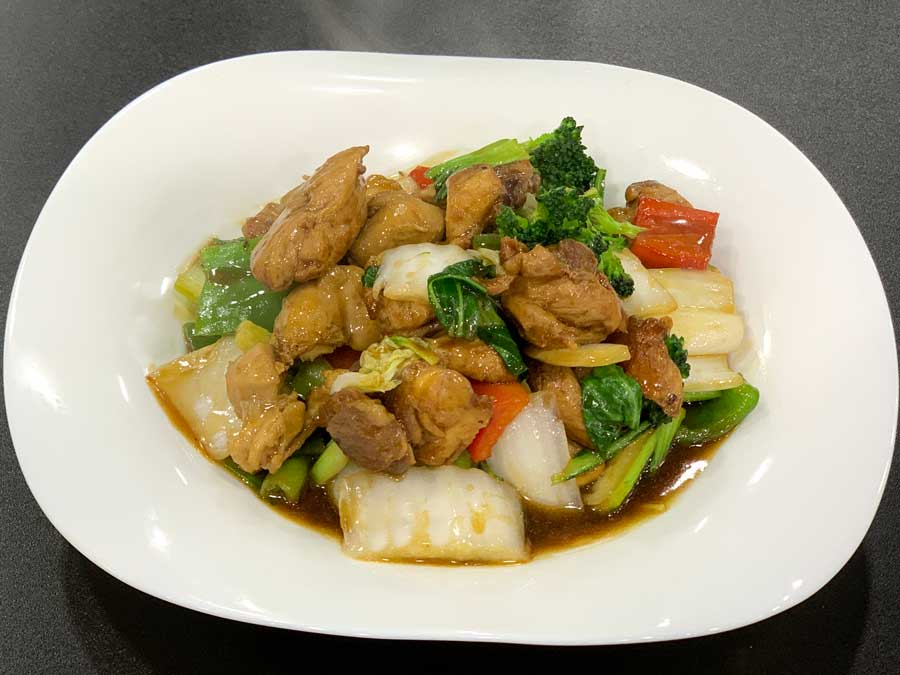 Pollo en trozos salteado con verduras acompañado de arroz chaufa.
