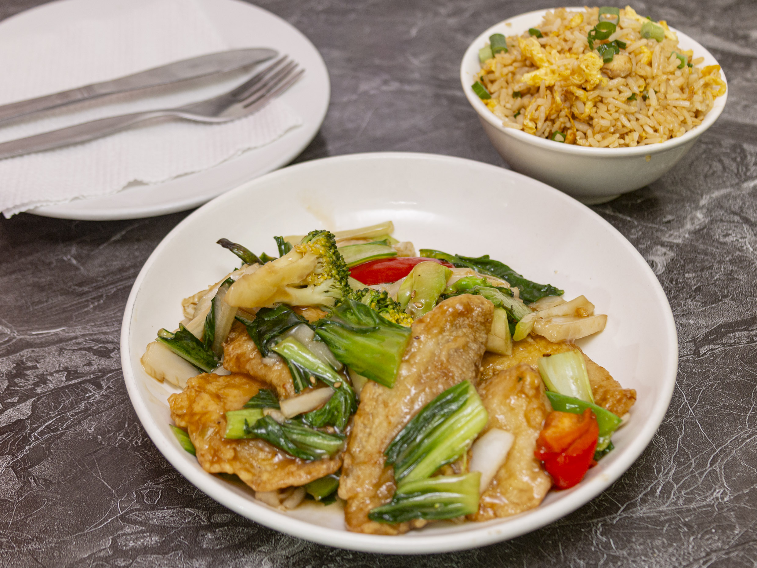 Pescado blanco salteados con verduras, acompañado de arroz chaufa.