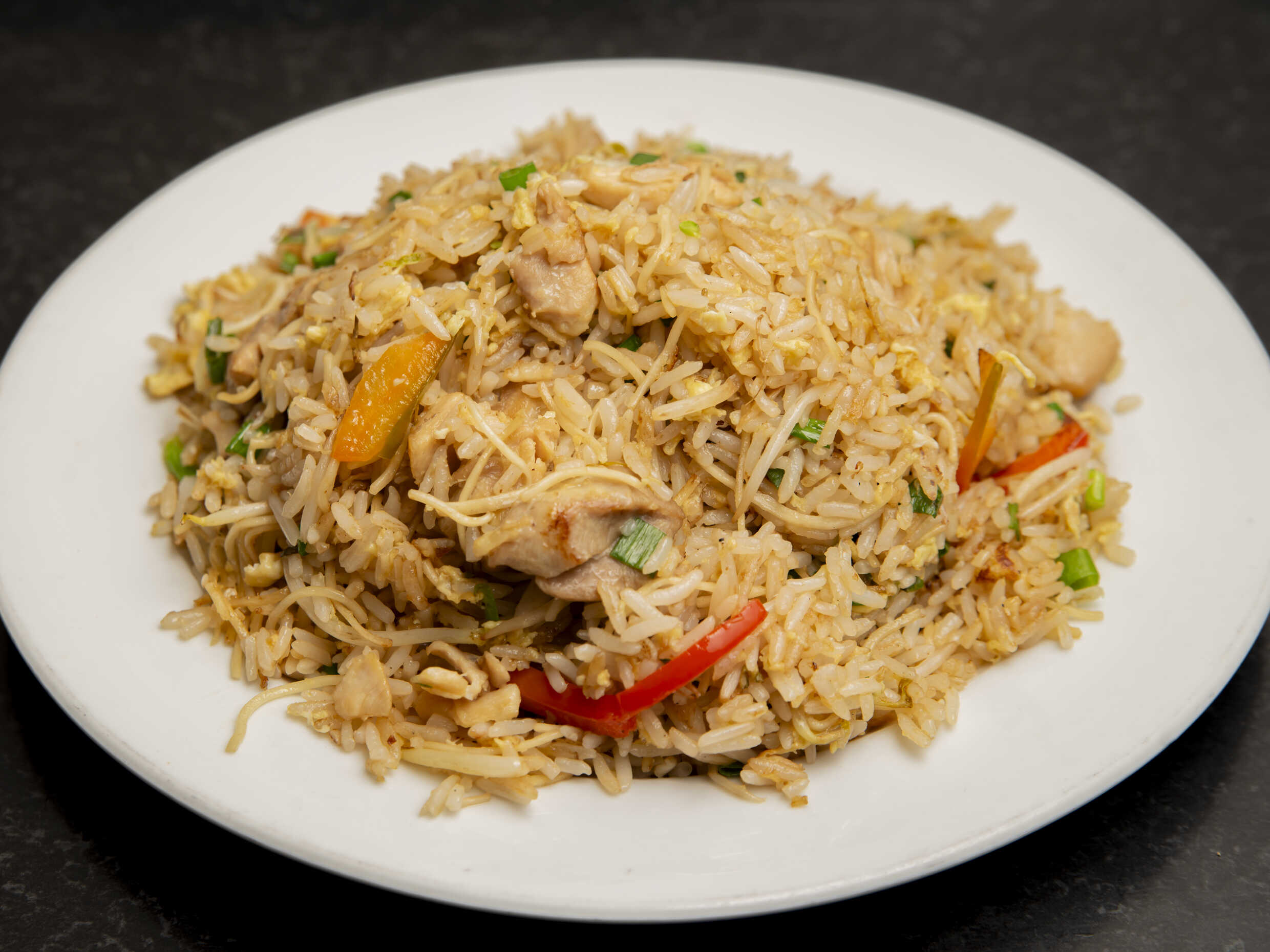 Arroz chaufa al wok con trocitos de pollo.