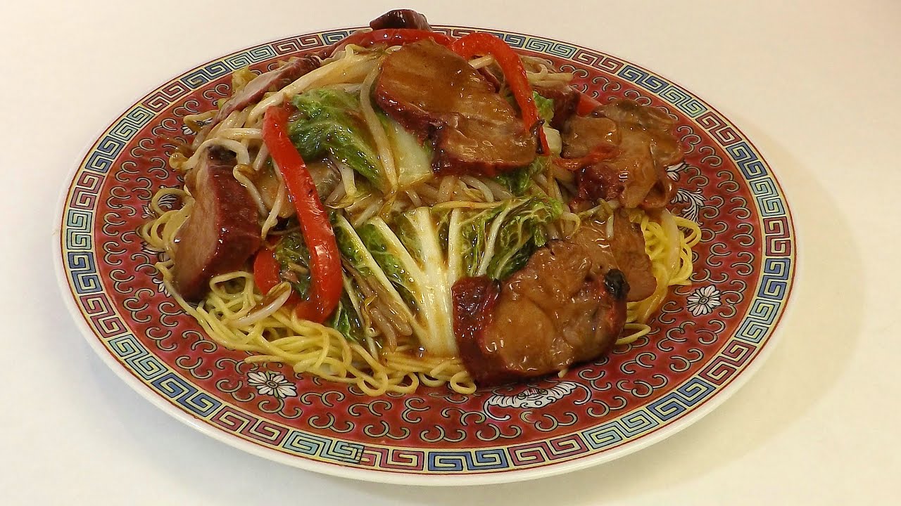 Tallarines fritos con pollo y verduras.