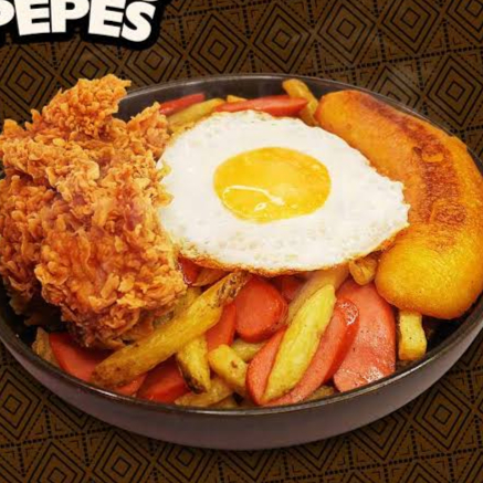 Broster+ papas + salchicha+ huevo + plátano+ ensalada+ cremas